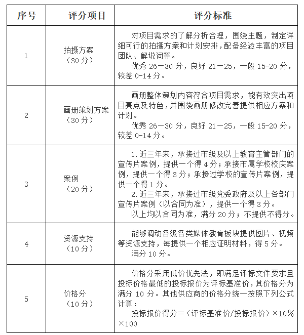 由合肥五中组织专家进行综合评审,对投标单位资质、实力、经验、业绩、支持资源和力量、项目团队资质、经验业绩,尤其是专题宣传片拍摄的初步策划方案、解说词、画册设计策划等情况进行综合评价打分,最终选定得分最高的为制作单位。