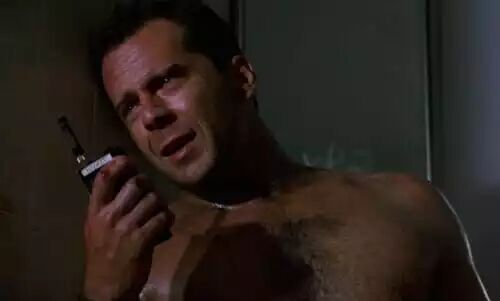 然后我们看到了《虎胆龙胆》的约翰·麦克莱恩,他是一个普通的爱说俏皮话的人,痛苦地大喊大叫,表面上是对妻子和自己的生命的担忧。