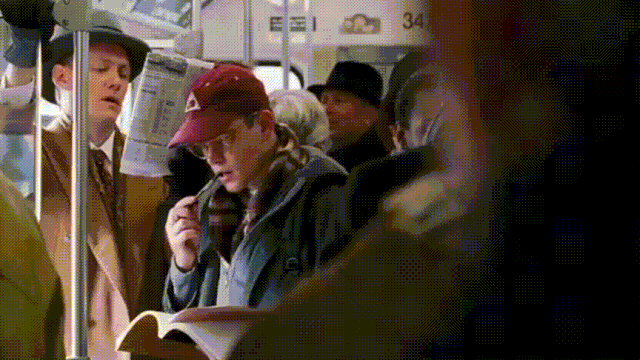 (a)莱纳斯面向前方,脸上毫无表情,轻轻地撩起一个股票交易员夹克的后摆,(b)大拇指和食指以无与伦比的灵巧手法解开了对方装有钱包口袋的纽扣。(c)然后,向后半节车厢看去,好像一切如常,无人注意……