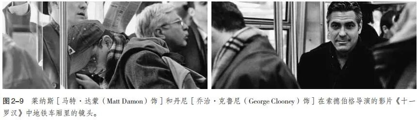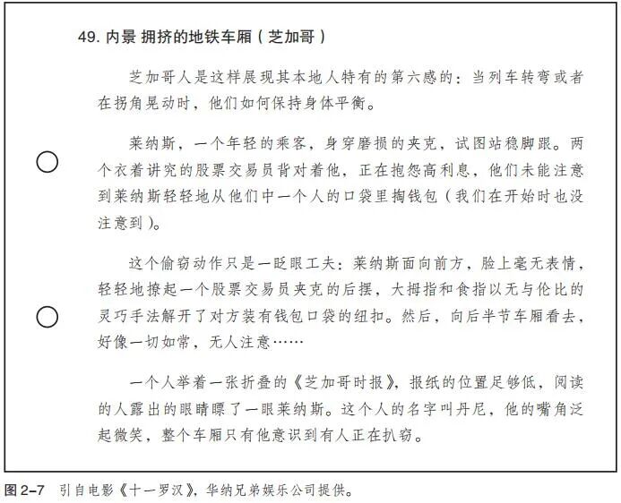 这段文字要用三个不同的景别来拍摄。为了表现毫无表情的脸和撩起外套的后摆(a),需要使用全景(全身)与中全景(膝盖以上)之间的镜头。然后,为了能够“看见”两个手指间灵巧的小动作(b),需要一个大特写。最后,为了看见半节车厢和其他乘客的形象(c),需要一个全景镜头;不能用特写。所以,作者是在用文字展现场景,而不是用标签为摄影机做出提示。当然,要小心过度使用这个方法。只有当故事需要展现准确的形象时才需要这样做。