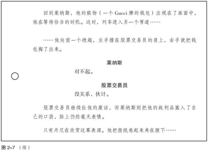 编剧只写了行动,但这段准确的描写让我们真的“看见”了这个扒窃过程是如何展开的,也展示了莱纳斯的扒窃技能,这在片子后面还会用得到。