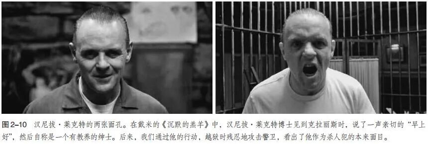 另一个很好的例子是汉尼拔·莱克特(Hannibal Lecter)这个人物(图 2-10),出自乔纳森·戴米(Jonathan Demme)导演的影片《沉默的羔羊》(Silence of Lambs,1991),编剧是泰德·塔利(Ted Tally)。汉尼拔通过对白把自己扮成一个博学、有文化、细腻、彬彬有礼的绅士。在初次见面时,他甚至对克拉丽斯·斯塔林(Clarice Starling)说:“对于我来说,无礼是丑陋的。”这是一个我们不会惧怕的人物,对吗?直到我们看见他把一个警察的脸皮揭了下来!汉尼拔是一个人物与声音截然相反而造成紧张感的绝佳例子。所以,如果你能够通过行动塑造人物的本性,他们的对白、声音就都可以用来添加或者细化他们的个性。行动呈现人物,对白反映心声。