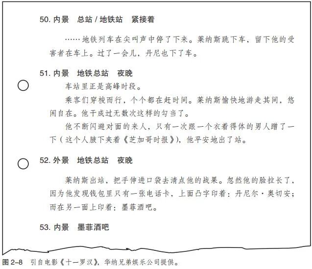 让我们举例说明通过行动展示人物要遵循什么原则。这里注重的是视觉化写作的技巧,通过观看来揭示内容,以及如何展现。我们用一个简单的段落来说明,取材自泰德·格里芬(Ted Griffin)为编剧的《十一罗汉》(图 2-7 和图 2-8)