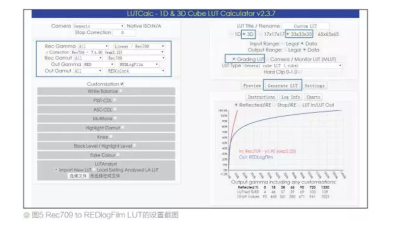 LUTCalc 中预置了现在主流摄影机的色域、Gamma 曲线、 Rec.709 标准等参数。 经过作者的测试, LUTCalc 完全可以用来制作 Rec.709 to Log类型的 LUT, 可以满足一般制作的需要。 图 5 为制作Rec709 to REDlogFilm LUT 的设置截图。
