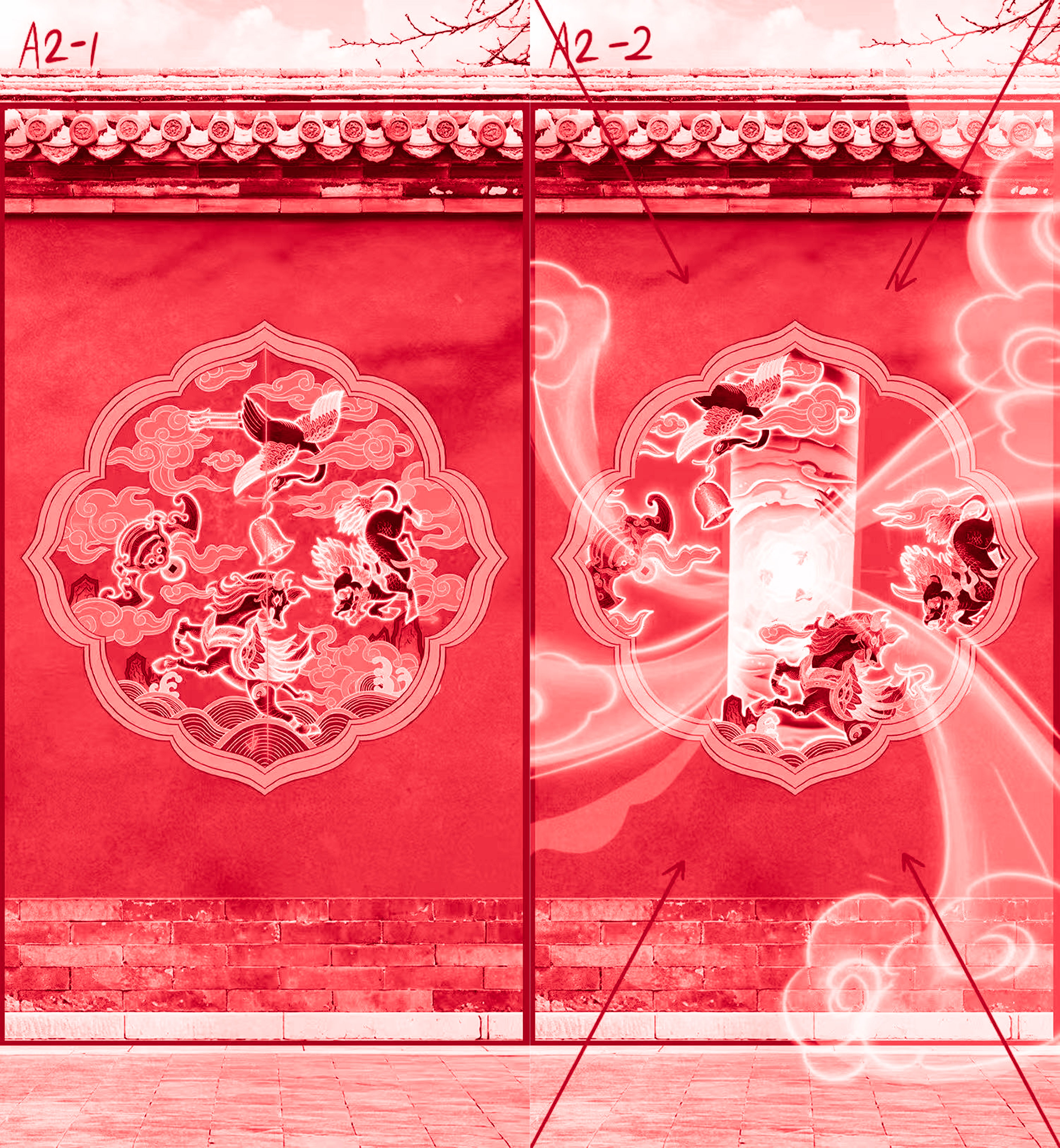 Red walls and shadow walls, with mottled light and shadow, a painting full of Eastern charm slowly unfolds before my eyes. The main title of 'Gathering Beasts for Blessing' and the logo of the Forbidden City complement each other in the picture, instantly immersing users in a strong cultural atmosphere of the Forbidden City. The project "Forbidden City auspicious beasts" aims to provide users with an innovative interactive form to deeply experience the charm of Forbidden City culture. We cleverly incorporate elements of Chinese culture: auspicious beasts, auspicious clouds, and bells (the bells are elegantly held by cranes and naturally integrated into the scene), with the interactive prompt of "Shake to awaken your exclusive auspicious beast", to stimulate users' curiosity and enthusiasm for participation.