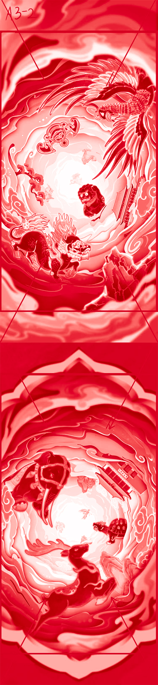 融合传统与现代元素,展现出独特的东方奇幻风格。画面以中国传统建筑和神话神兽为主题,采用平面插画的形式,线条简洁流畅,造型夸张变形,具有强烈的装饰性和艺术感。色彩上以红、金为主色调,搭配蓝、绿等冷色调,形成鲜明对比,既体现了中国传统文化的吉祥寓意,又增强了画面的视觉冲击力。画面中的神兽形象生动,细节丰富,如象的庄严、龟的沉稳、马的矫健等,都通过简洁的线条和夸张的造型表现得淋漓尽致。整体画风既保留了传统文化的韵味,又符合现代审美需求,使观众在欣赏画面的同时,感受到浓厚的东方文化魅力。