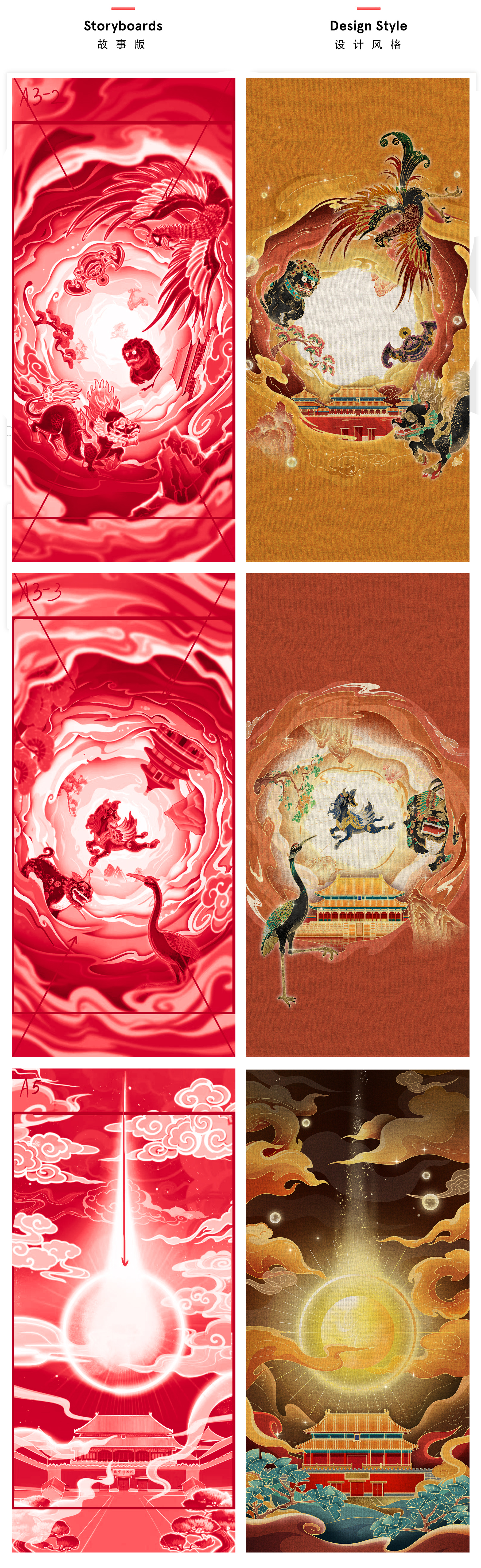 表现手法上独具匠心,巧妙融合传统与现代元素。运用平面插画风格,结合MG动画的简洁明快,使画面既具艺术感又富有现代感。通过神兽环绕建筑的构图,营造出神秘而庄严的氛围,象征传统文化的深厚底蕴。画面中的元素,如云纹、光芒等,不仅起到装饰作用,还增强了画面的动态感和空间感,使观众仿佛置身于奇幻世界。在细节处理上,精致的神兽装饰和建筑纹理展现了高超的设计水准,体现了对传统文化的尊重与传承。整体表现手法既保留了传统文化的精髓,又通过现代设计手法赋予其新的生命力,使动画在视觉和内涵上都达到了高度统一。