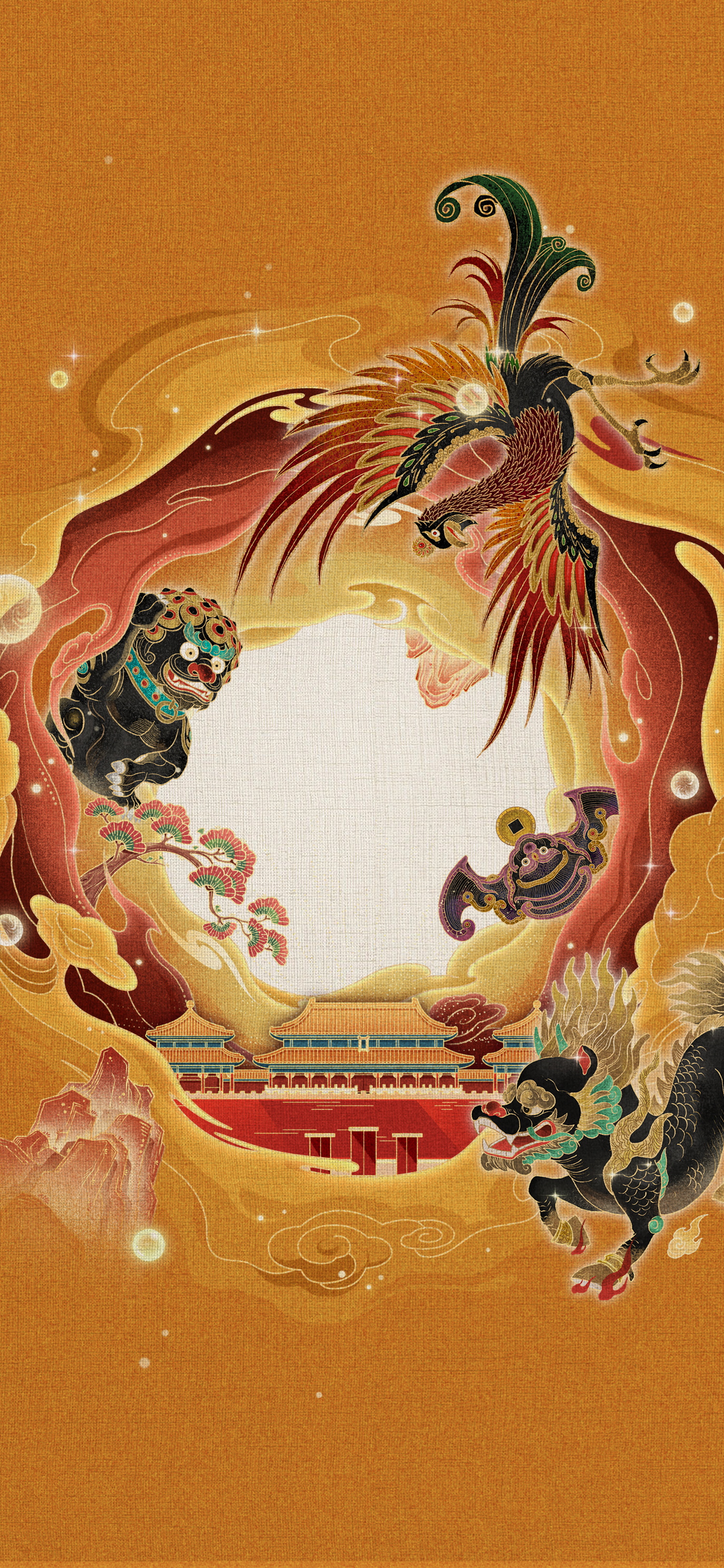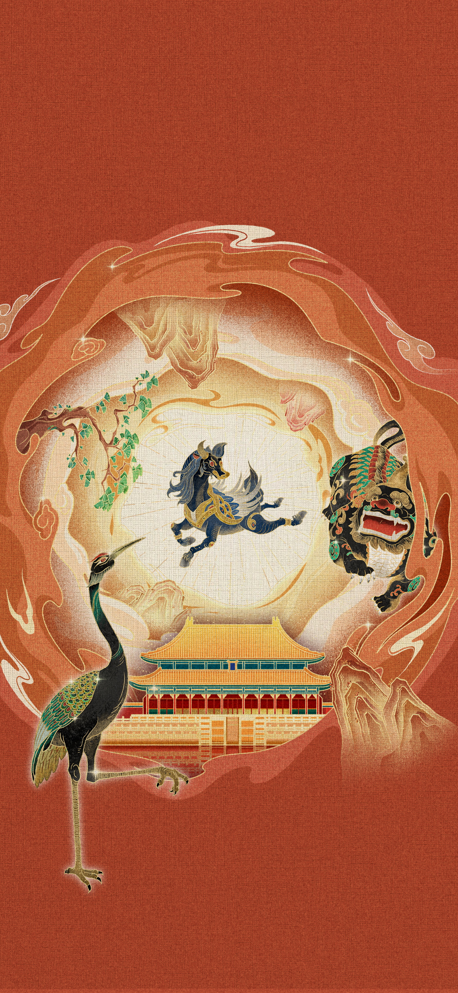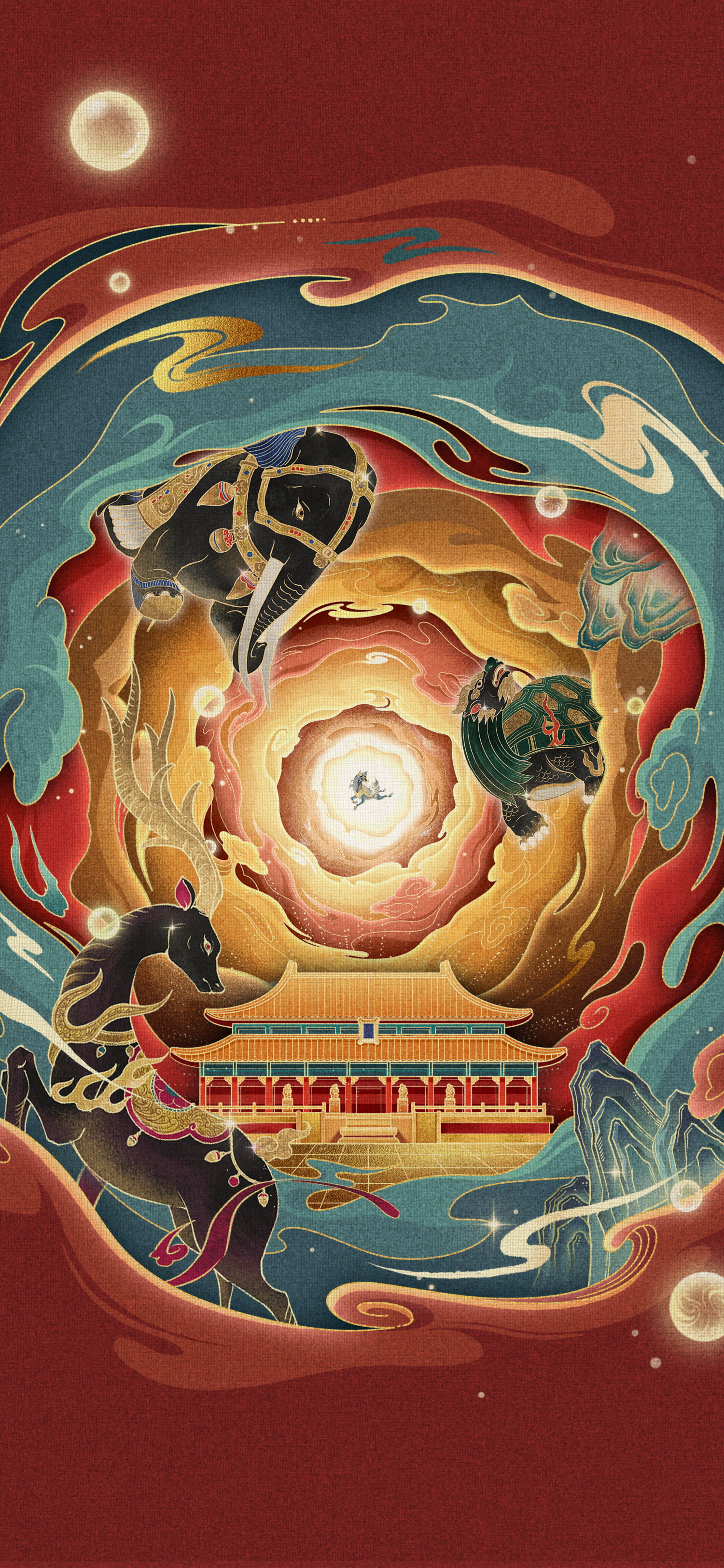 Integrating traditional and modern elements, showcasing a unique Eastern fantasy style. The screen is themed around traditional Chinese architecture and mythical beasts, using flat illustrations with simple and smooth lines, exaggerated and deformed shapes, and strong decorative and artistic qualities. In terms of color, red and gold are the main tones, paired with cool tones such as blue and green, forming a sharp contrast. This not only reflects the auspicious meaning of traditional Chinese culture, but also enhances the visual impact of the picture. The images of divine beasts in the picture are vivid and rich in details, such as the solemnity of elephants, the calmness of turtles, and the agility of horses, all expressed vividly through simple lines and exaggerated shapes. The overall art style not only retains the charm of traditional culture, but also meets modern aesthetic needs, allowing the audience to appreciate the rich charm of Eastern culture while appreciating the picture.