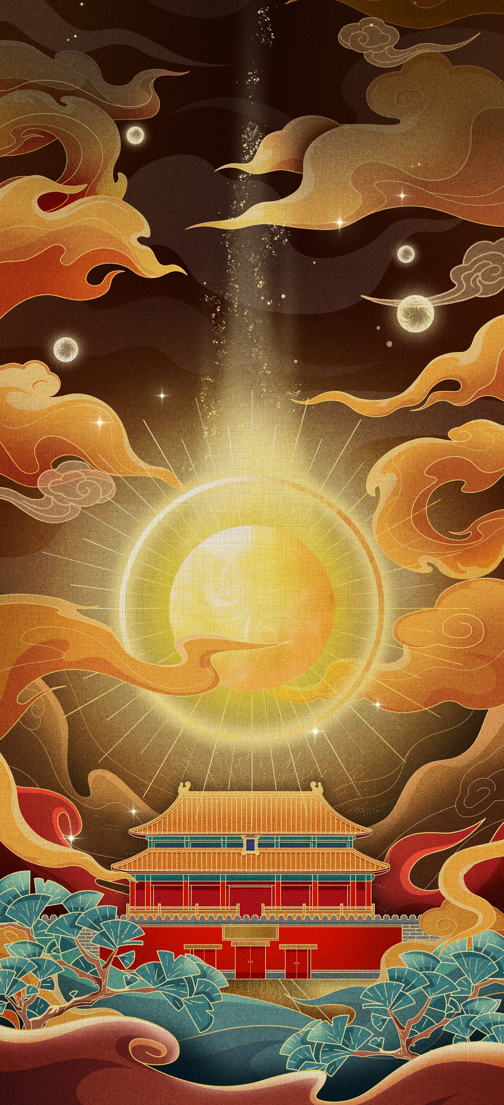 以红、金为主色调,象征着吉祥、富贵和权威,符合中国传统文化的审美观念。红色用于建筑墙体,金色用于屋顶和装饰,形成鲜明对比,突出建筑的宏伟与庄严。同时,搭配蓝、绿等冷色调,如云纹、神兽的羽毛等,增加了画面的层次感和丰富度,避免了单一色调的单调感。在光影处理上,通过金色的光芒和柔和的月色,营造出神秘而梦幻的氛围,增强了画面的奇幻感和空间感。整体色彩搭配既体现了传统文化的深厚底蕴,又符合现代审美需求,使画面在视觉上极具吸引力,给观众留下深刻印象。