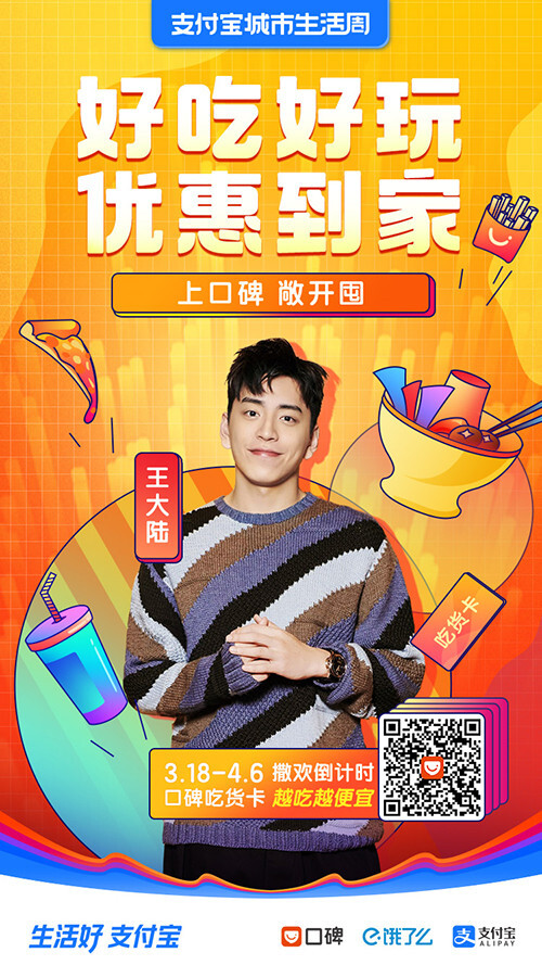2020年3月份,口碑×饿了么邀请到郭采洁/王大陆/文苡帆/施柏宇四位男神女神们,为支付宝城市生活周打call!