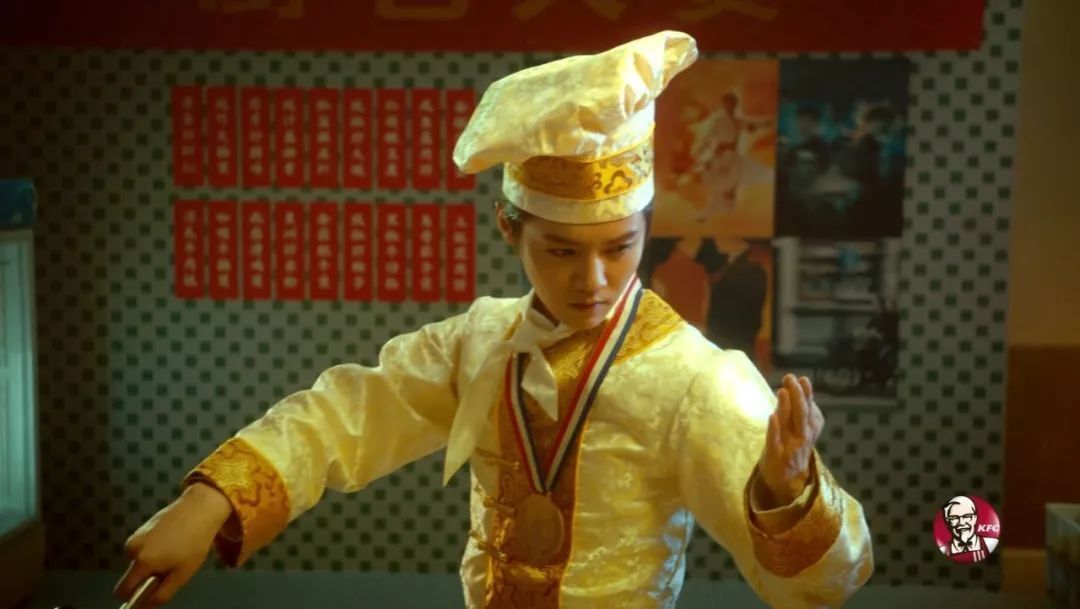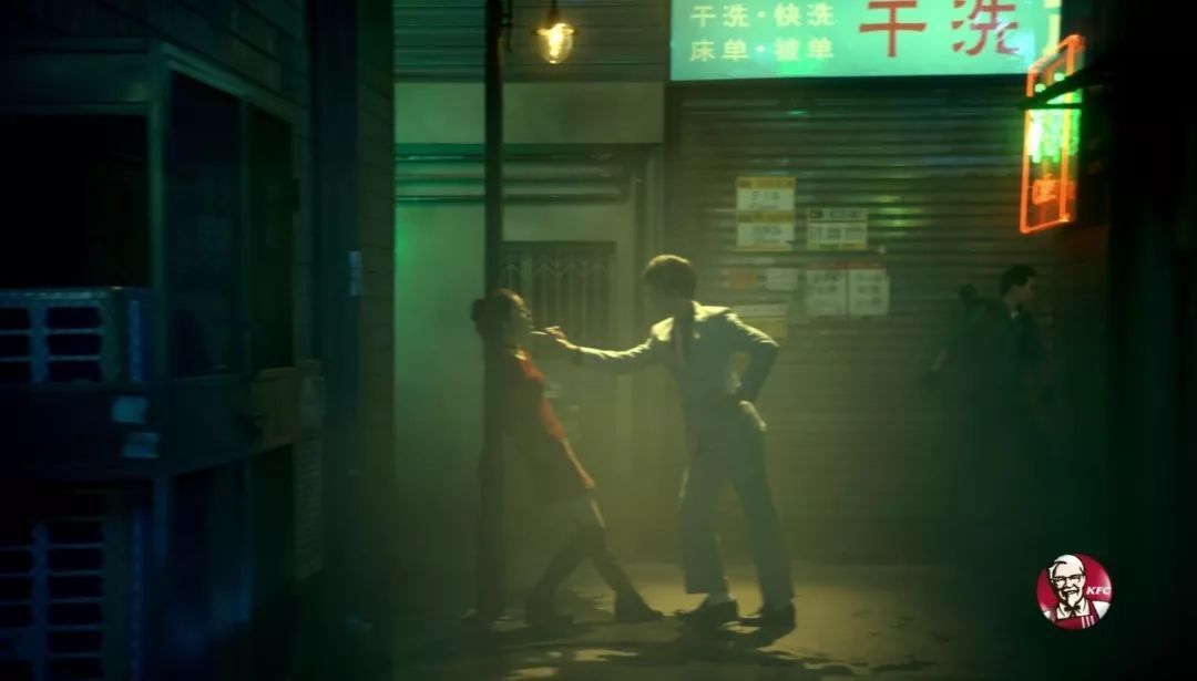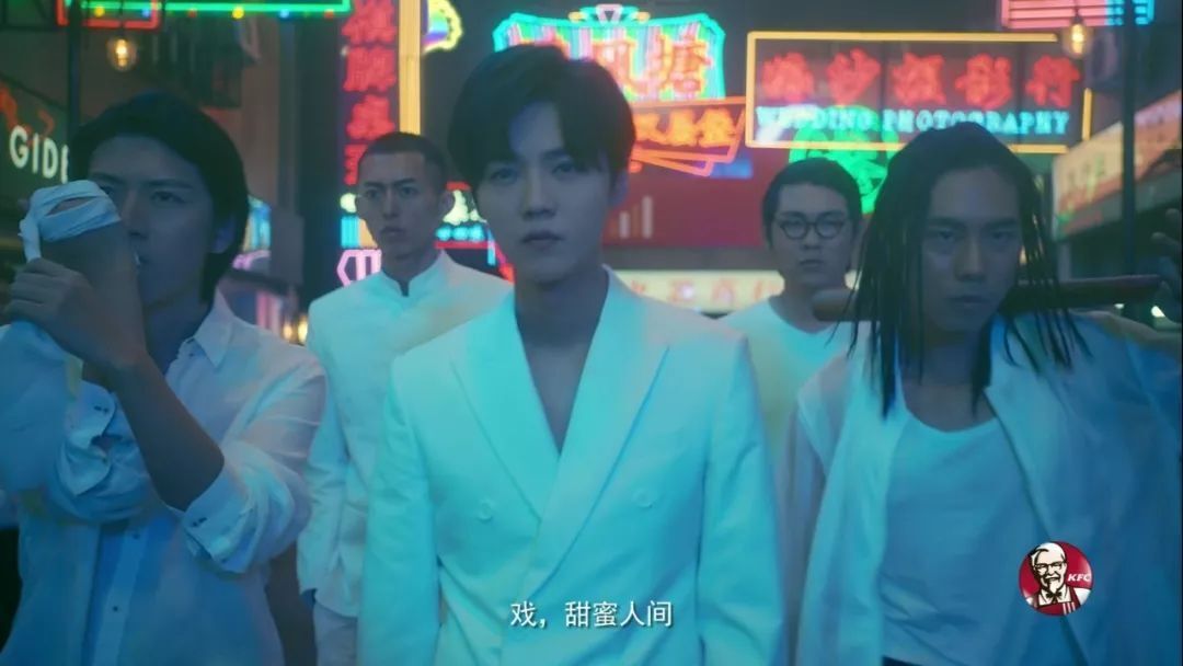 其实从这支1′19″的广告里,我们可以看到肯德基在广告风格上的突破。这次肯德基的产品广告,终于不再是商务办公场景+产品细节特写的就套路,而是大玩港式江湖情怀,用镜头和场景的穿插来致敬80、90年代的香港经典电影。