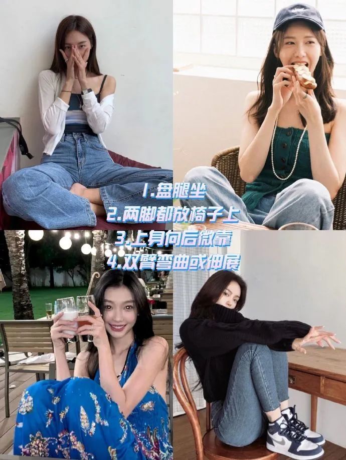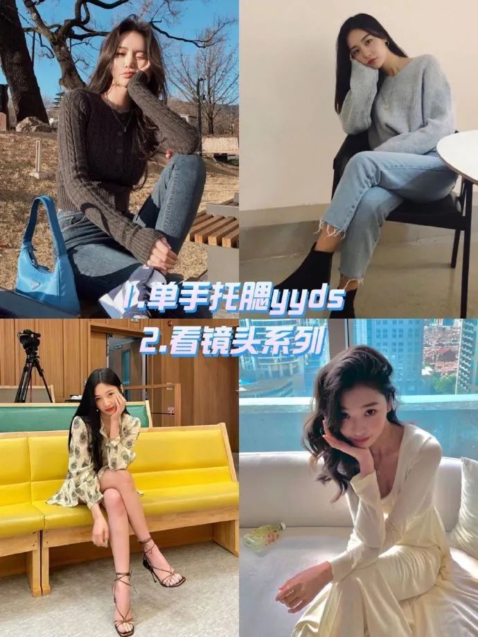 拍照姿势:整理了一些明星网红们常用的坐着拍照pose,简单好学,搭配各种风格都可以。