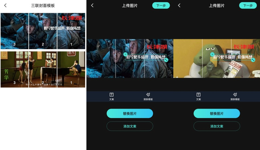 选中模板后,我们可以替换模板中的图片,替换的图片会自动被切割成三份: