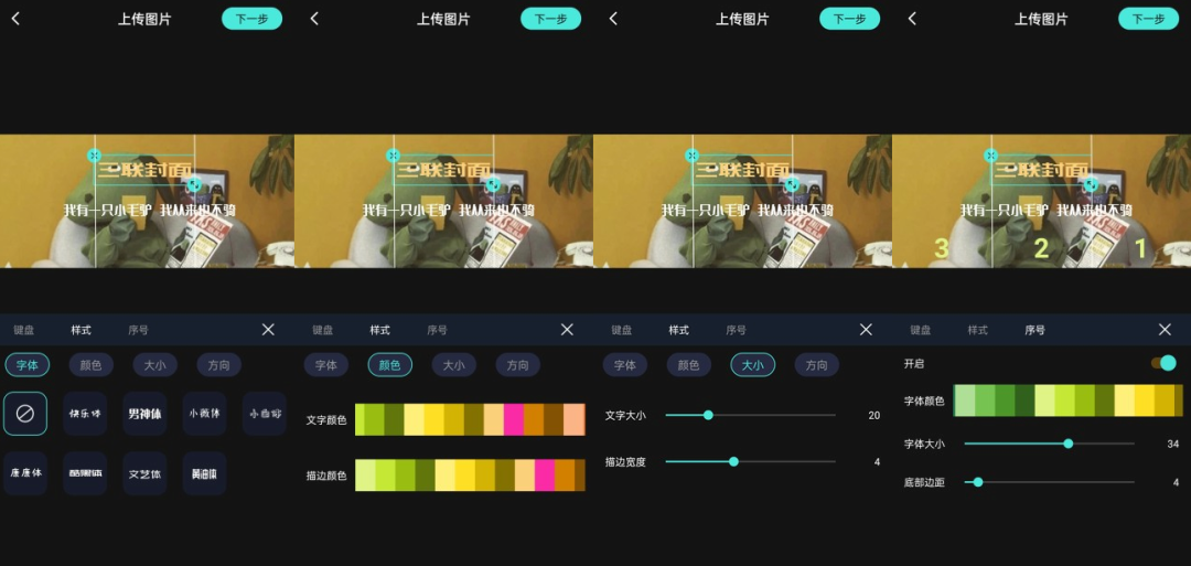 在编辑文案时,可以选择不同的字体、文字颜色、文字大小、以及文字方向。