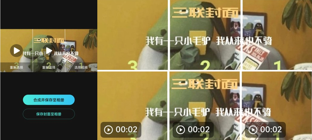 封面设置完成后,点击右上角的“下一步”,随后可以直接保存封面在相册,也可以为每一个封面选择一个视频,并把封面和视频合成保存到相册。