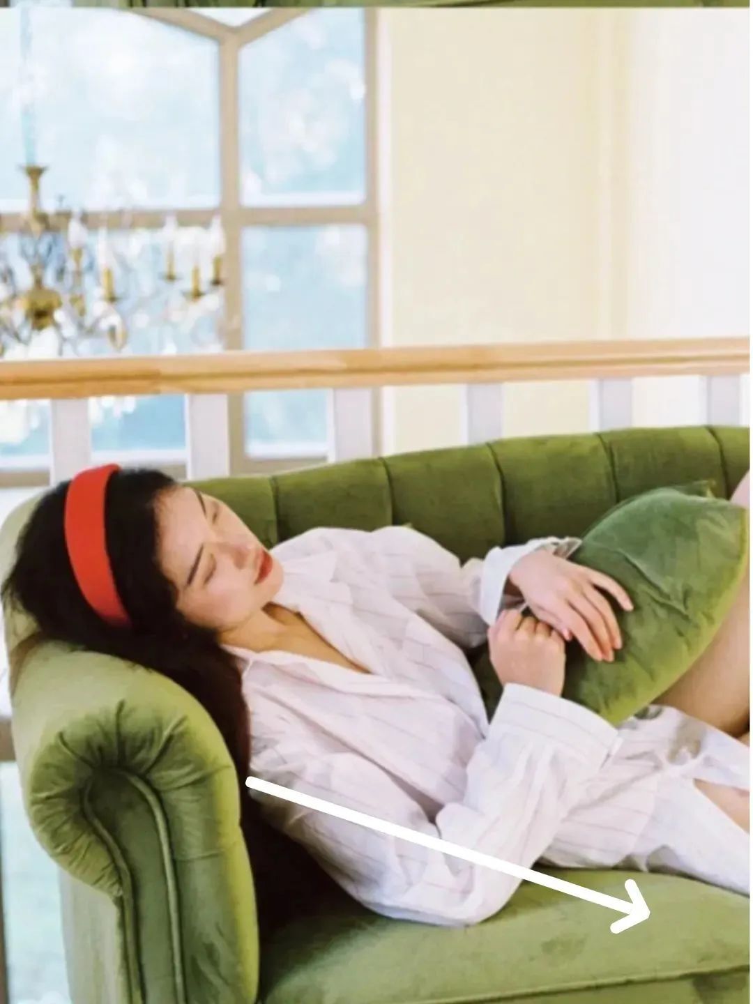 用一个小垫子垫在腰下,把上半身撑起来一点,整个人上镜更苗条。