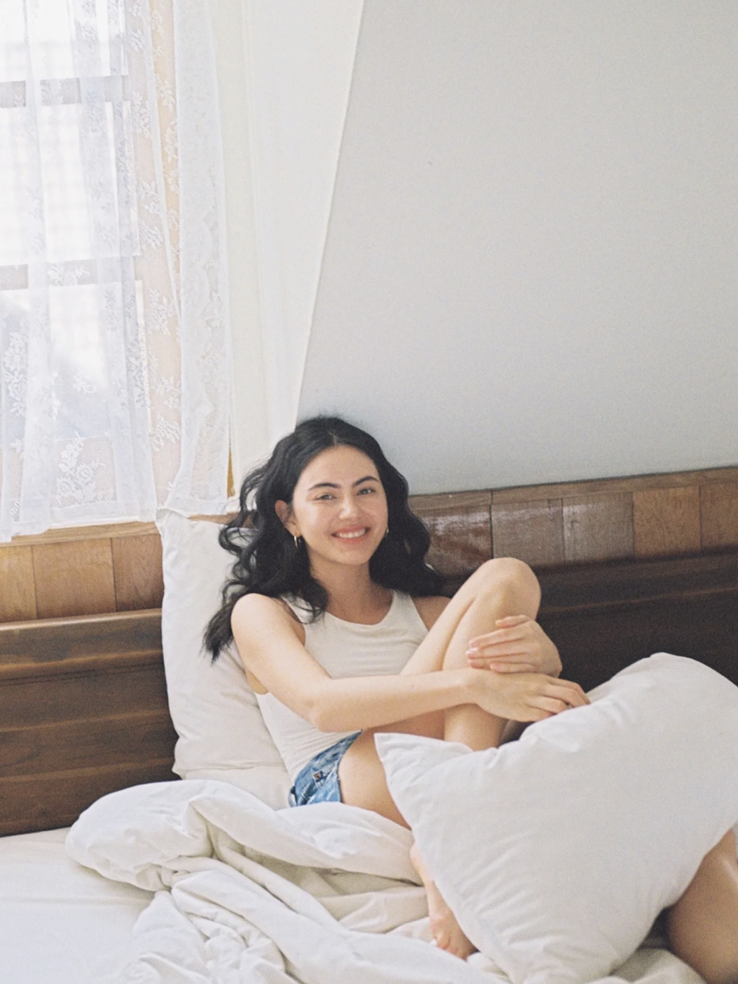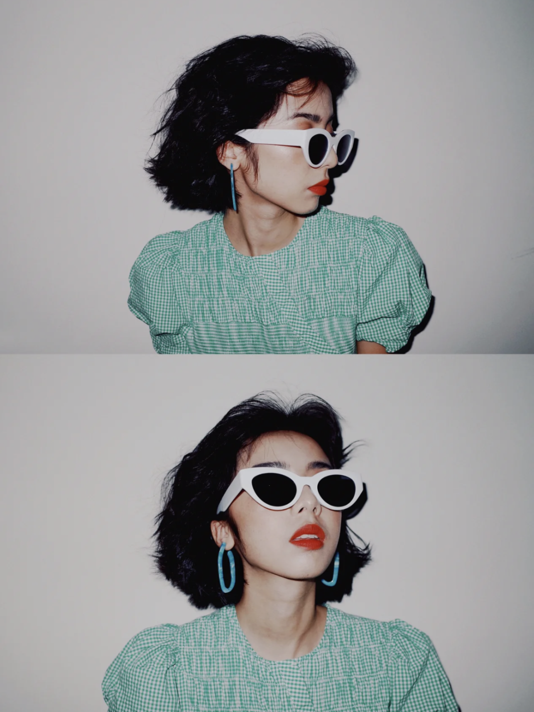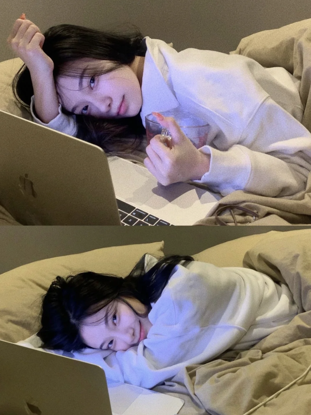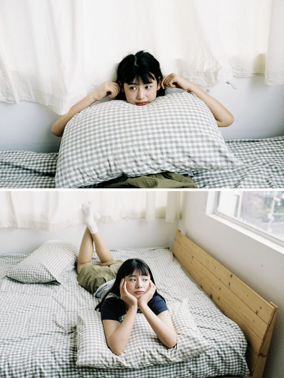 手里抱着枕头做鬼脸,趴在枕头上支着脑袋上下两张拼起来很有日杂的质感。