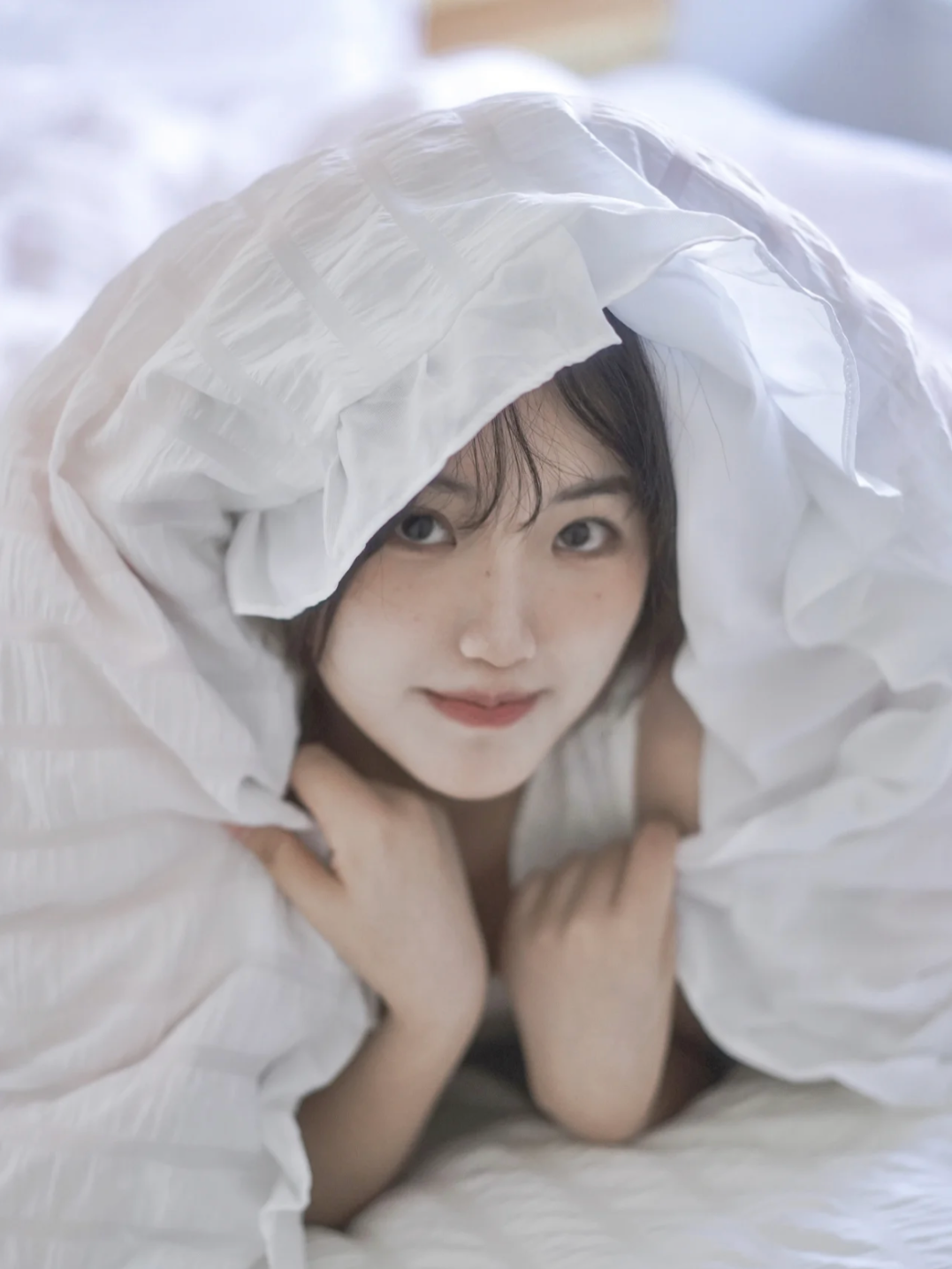 刚睡醒从被窝钻出来只露个小脑袋的模样,妥妥的男友视角~