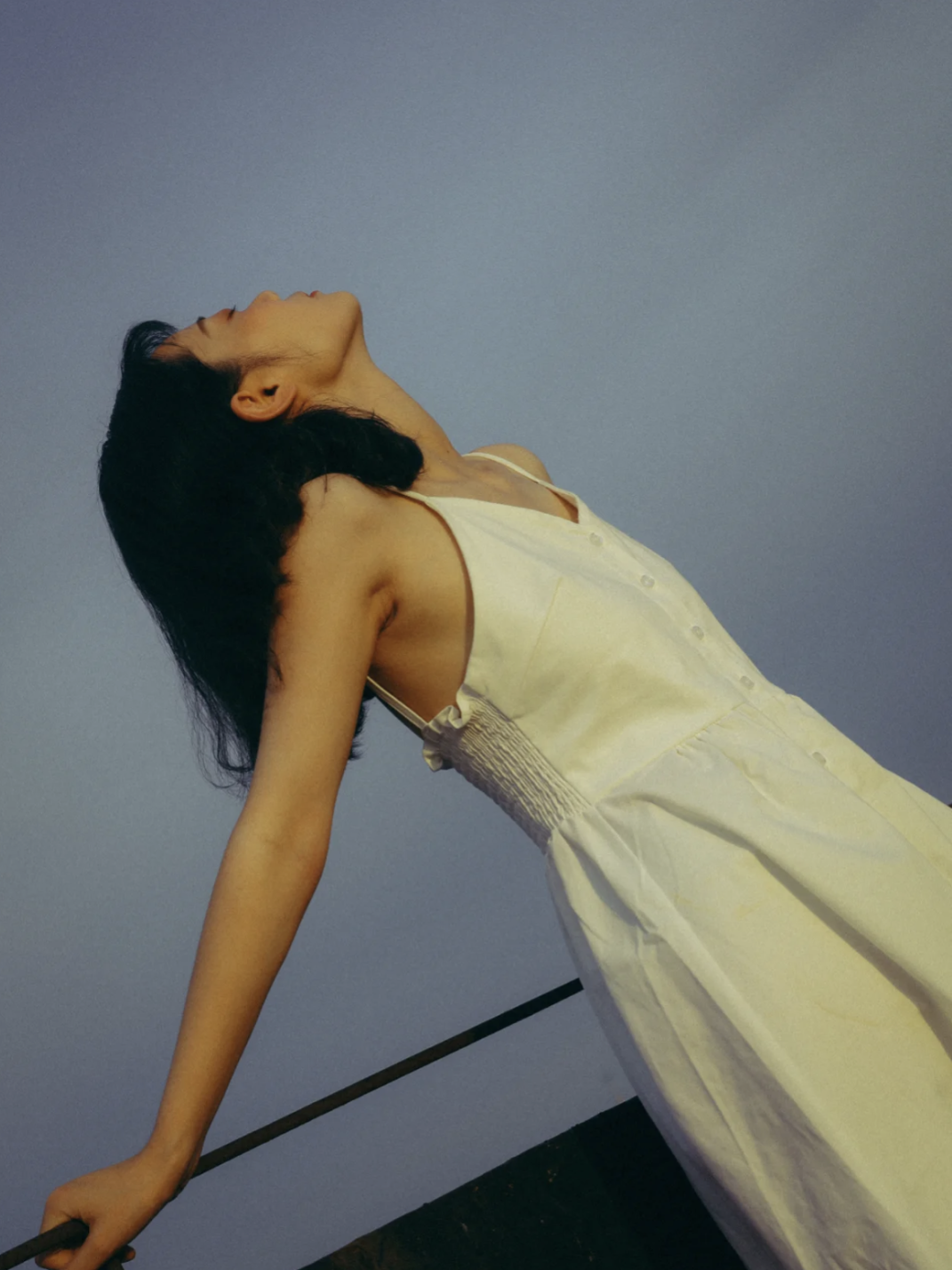轻轻依靠在围墙上,从下向上45°仰拍,这个方法不管是阴天还是晴天都适用。