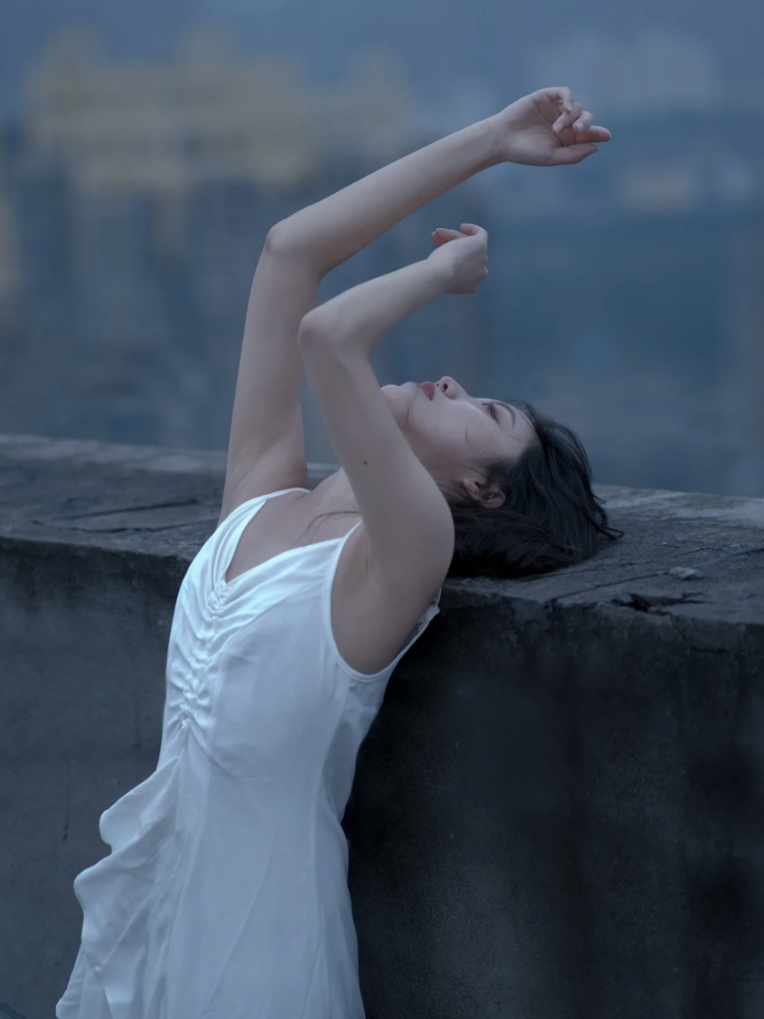 夜晚城市灯火通明,夹杂着夕阳的余晖作背景更带感,舒展身体依靠在栏杆上,只突出人物轮廓最迷人~