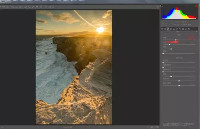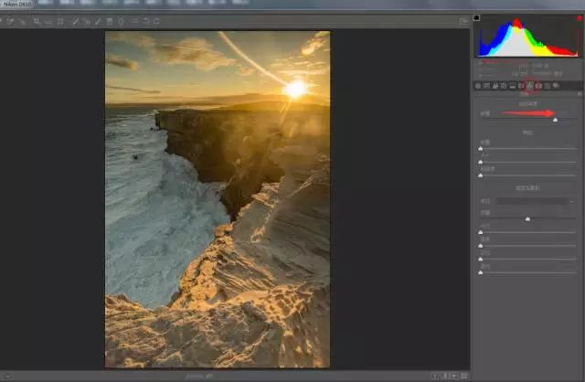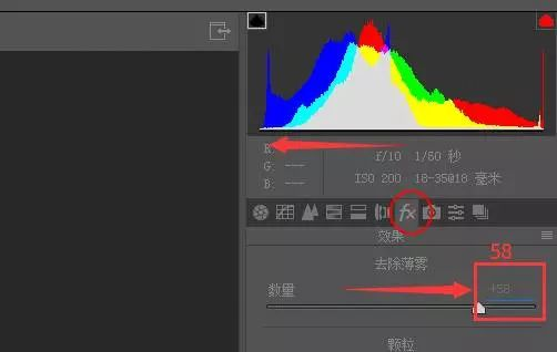五、在效果选项里调整“去除薄雾”滑块,重塑明暗对比,使照片更加的立体。通过这三步,一张照片的大致雏形已经调整出来了。但这样的片子还不够好,所以我们还要接着往下调整。