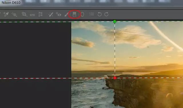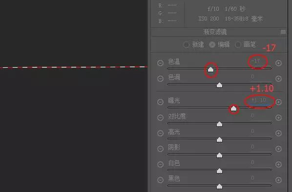 九、进入“渐变滤镜”选项,参数设置为增加曝光和降低色温(偏蓝,修图软件的色温和相机设置相反),反向修复拍摄时使用灰渐变镜带来的暗边。区域控制如图。