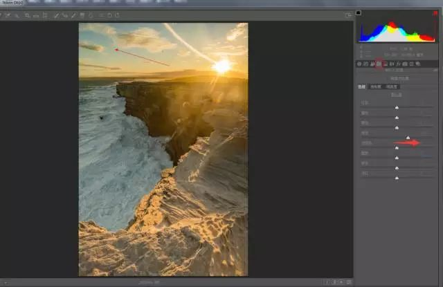 十、进入“HSL”选项,将天空青蓝色还原,增加画面的色对比。