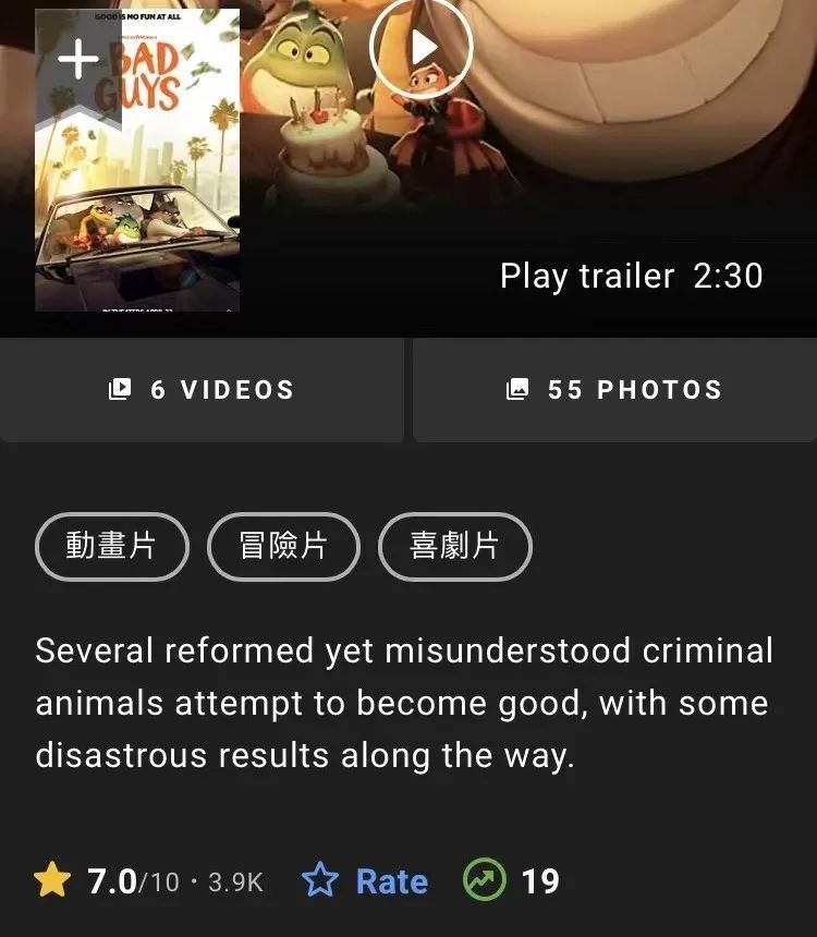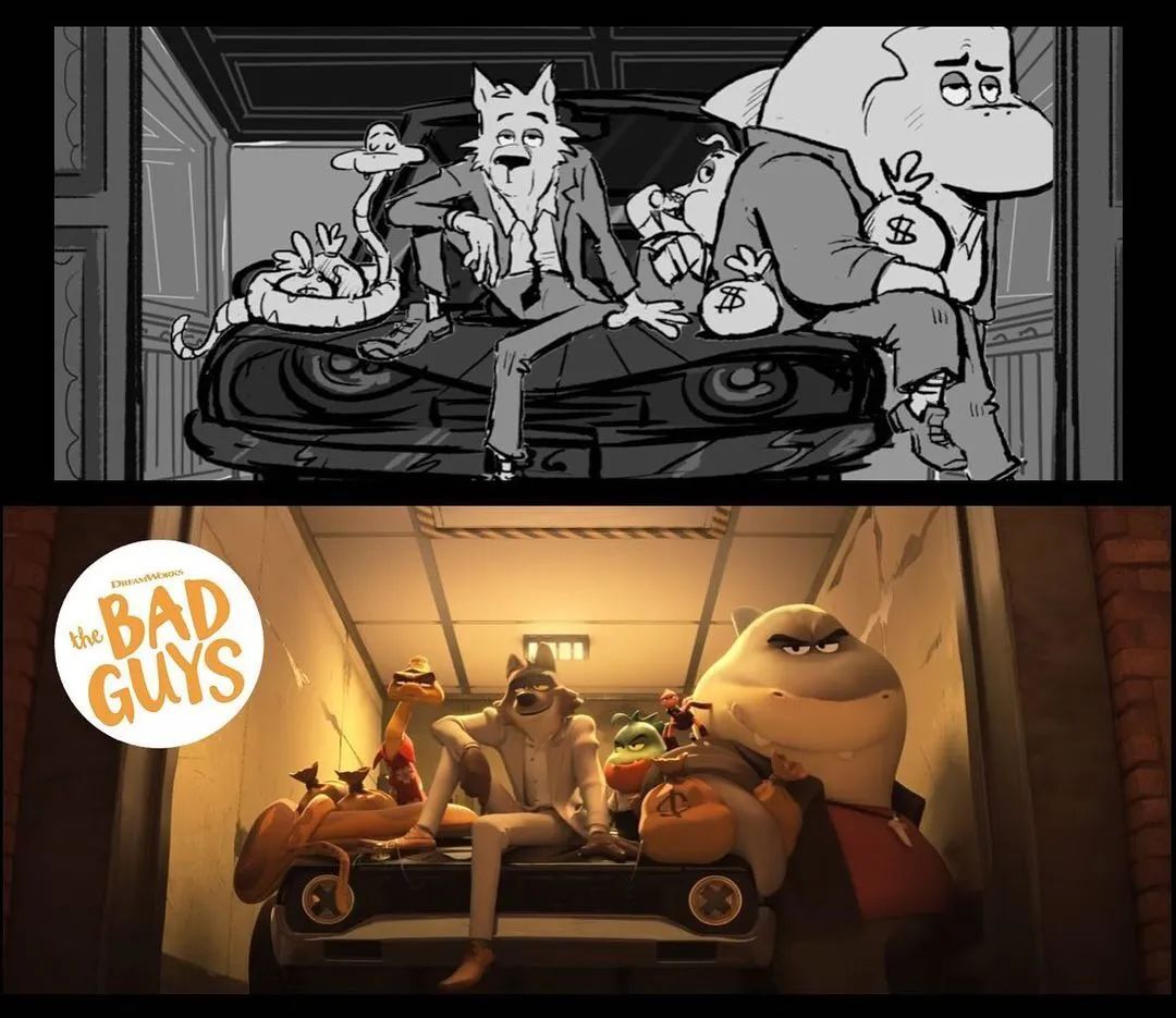 导演建立了一个人类和动物共生的世界。人类对“坏蛋们”与生俱来的恐惧使得他们固化了自我的认知,从未设想过自己的生活还有另一种可能——做个好人。这种意识的冲击、认识的转变也造就了本片的喜剧效果,也塑造了坏蛋们可爱、天真的形象。