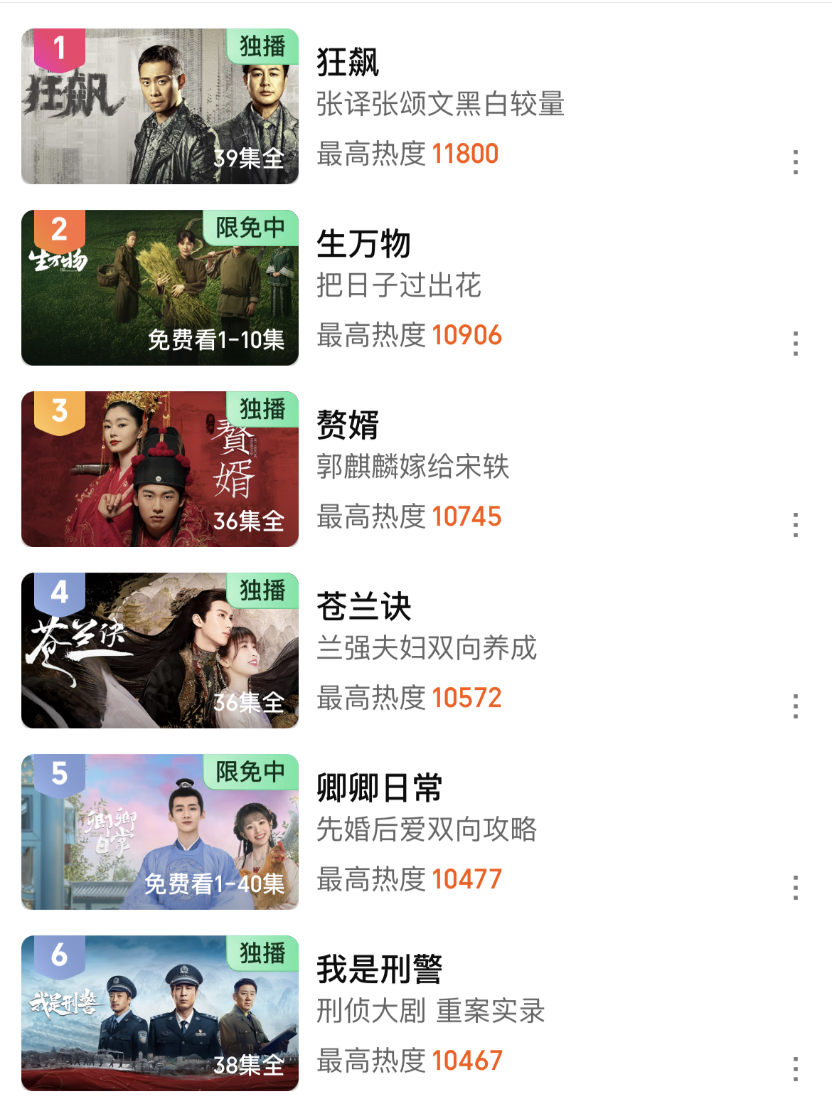 《生万物》开播一周,爱奇艺最高热度值破10900,位列历史第二,仅次于《狂飙》(11800)。
