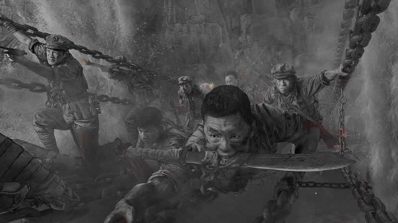 点石数码运用该电影级拍摄手法,展现了影片中泸定桥、罗布泊等镜头。子弹时间定格战士拿着武器冲锋陷阵的姿态,空中绷直的铁索、迸溅的水雾与人物坚毅表情形成极具张力的"动态雕塑"。