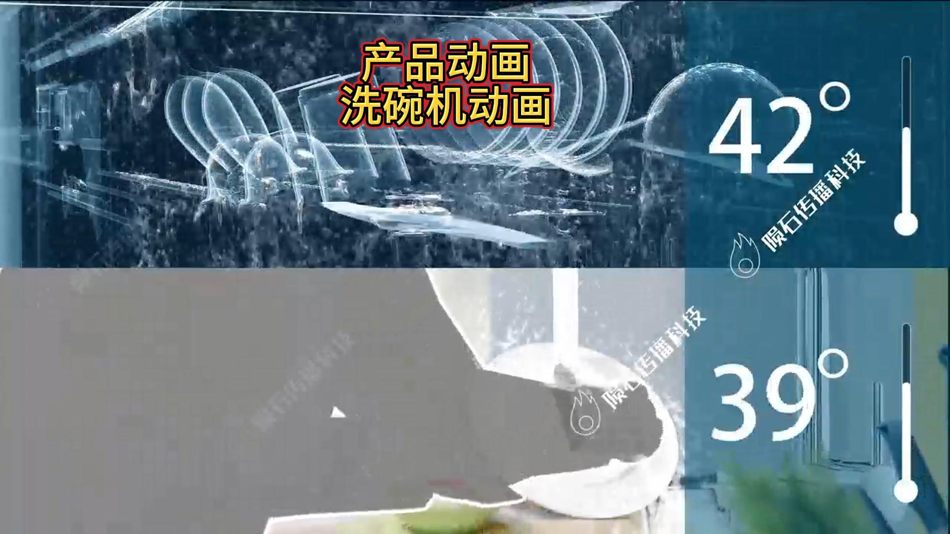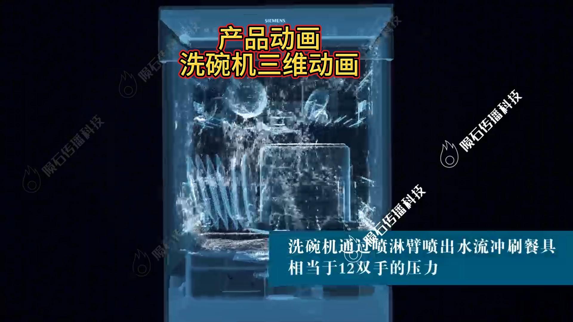 此三维动画展示了西门子洗碗机的工作流程:先经 5 分钟或 12 分钟预洗,借助喷淋臂喷出相当于 12 双手压力的水流冲刷餐具;20 分钟后进入 40℃主洗阶段,35 分钟后主洗水温升至 70℃,通过不同阶段的水温与高压水流配合完成餐具清洁。如图所示