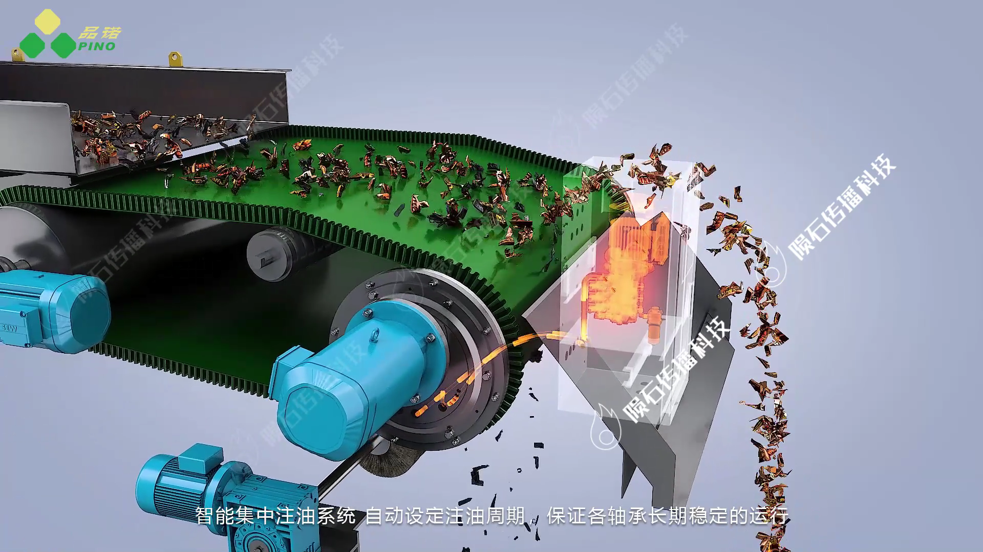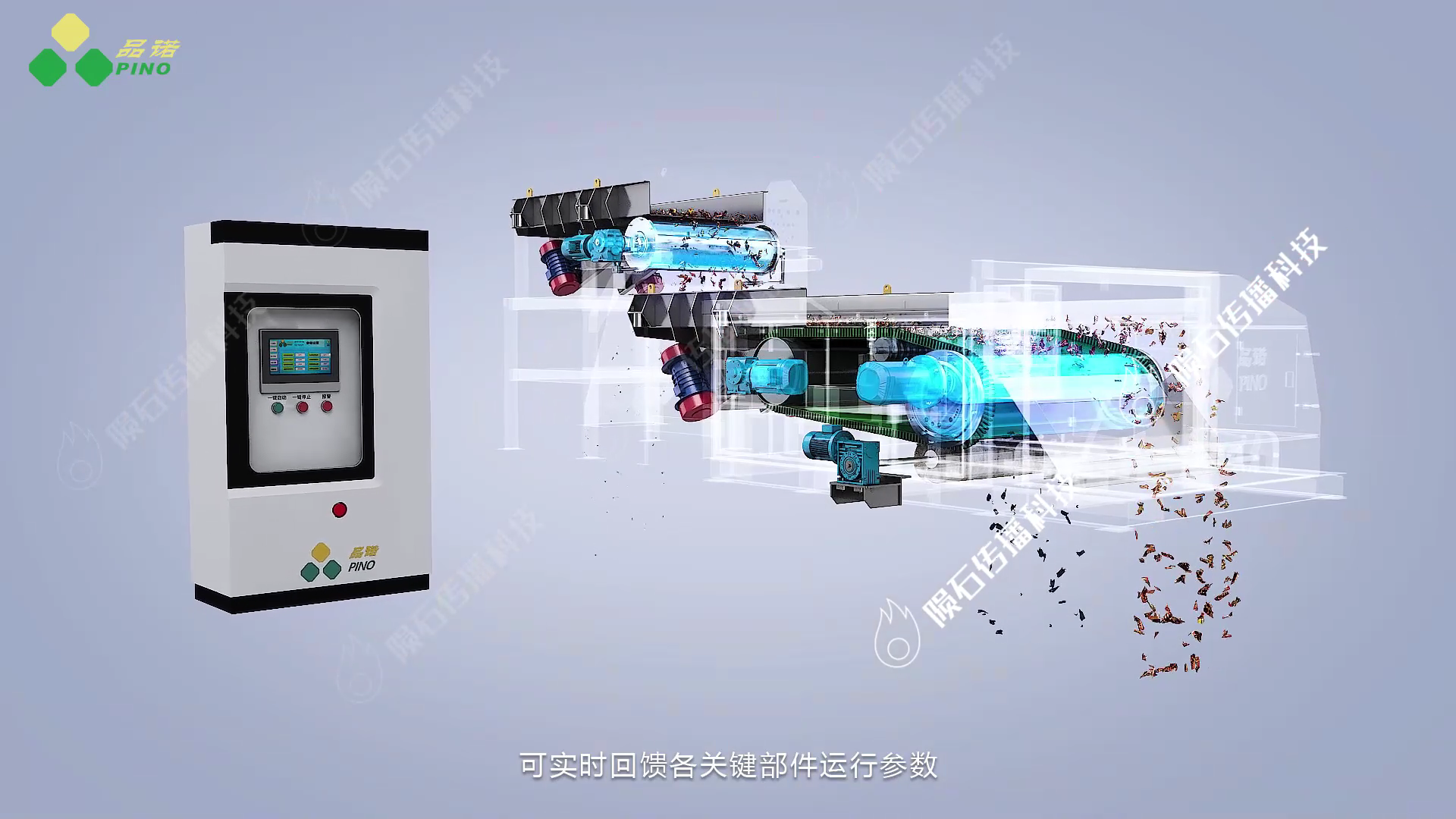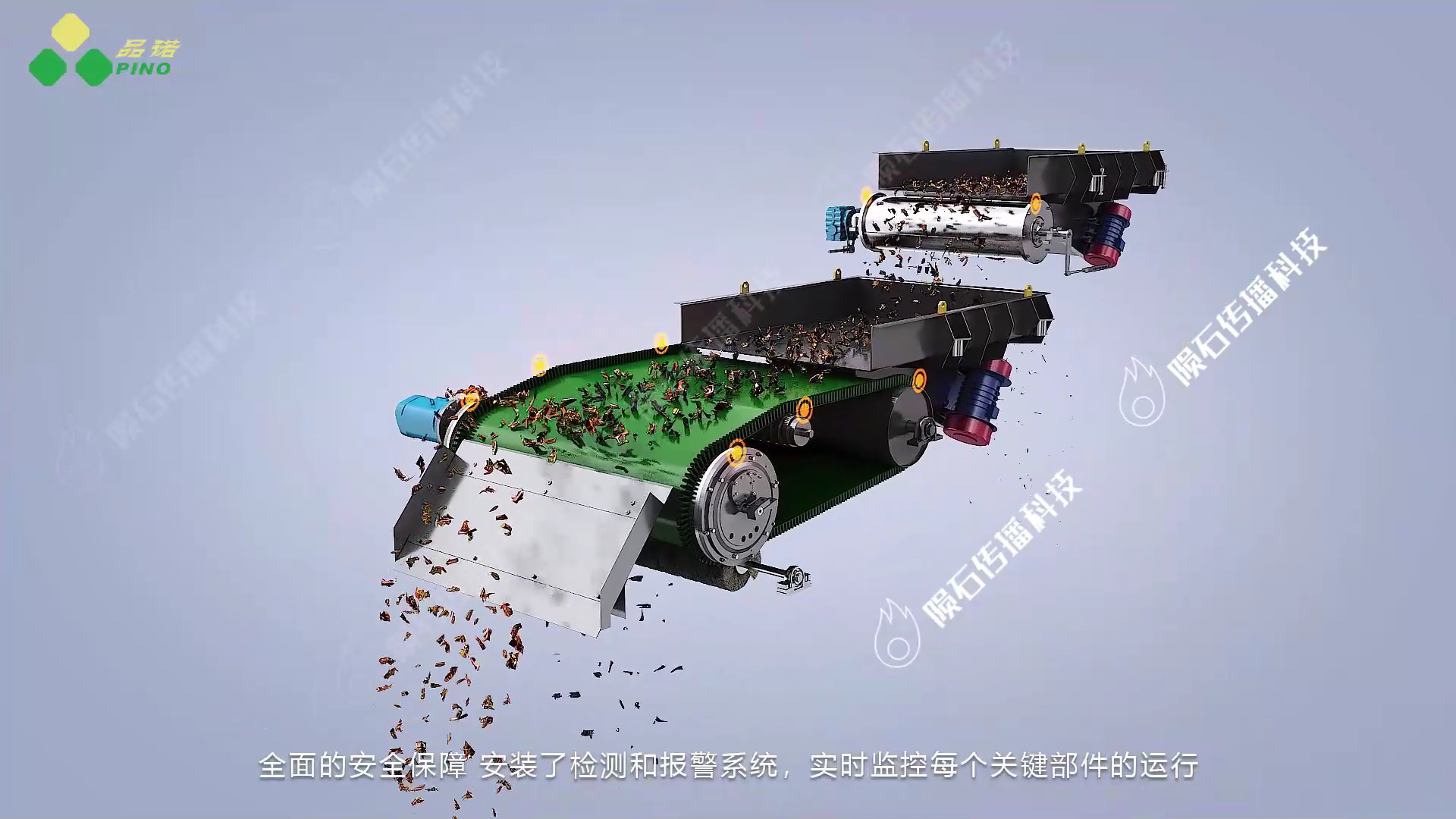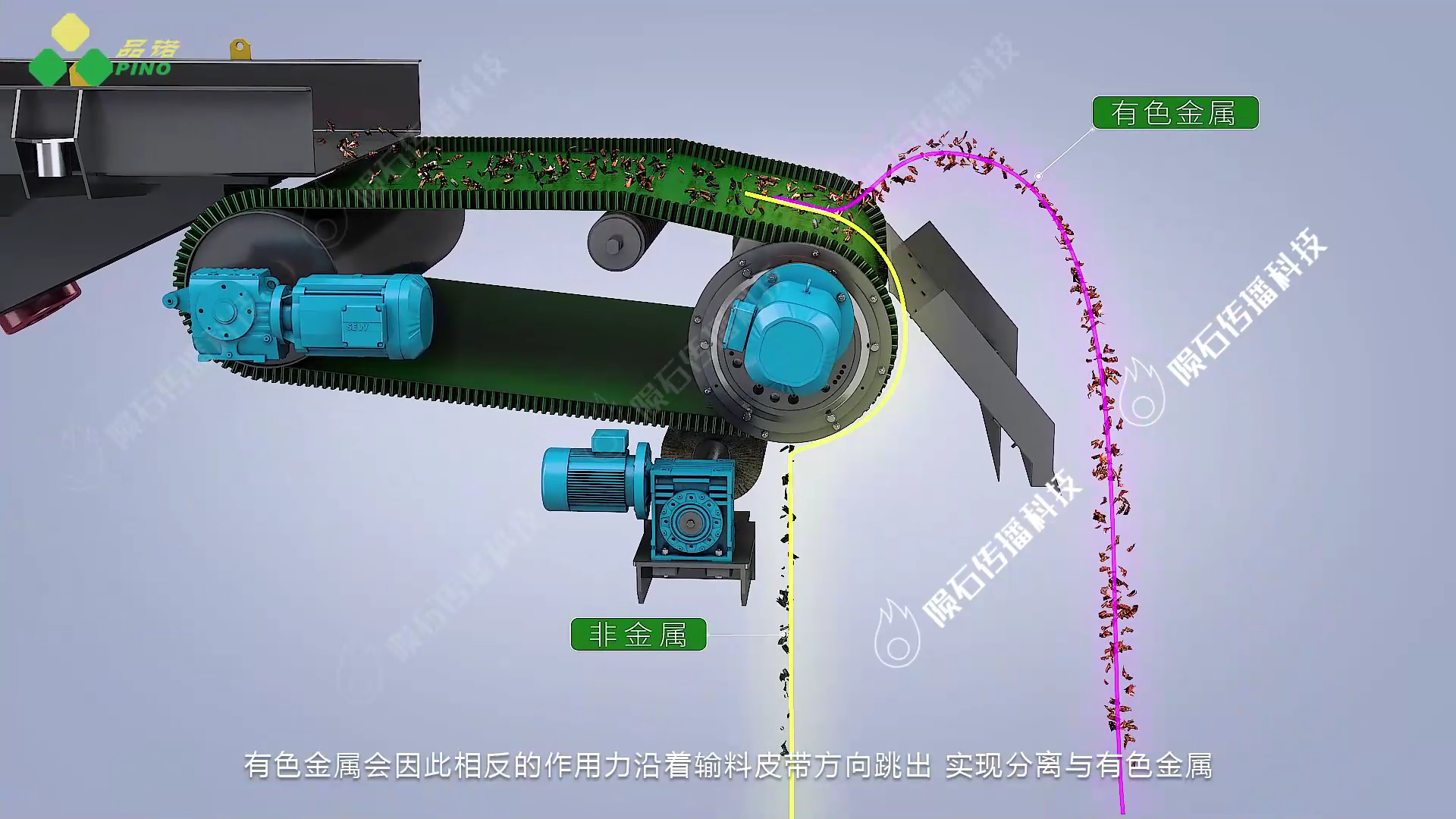3D 动画将重点呈现品诺公司涡电流分选机的两大核心:设备构成与工作流程。