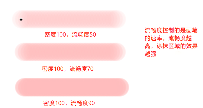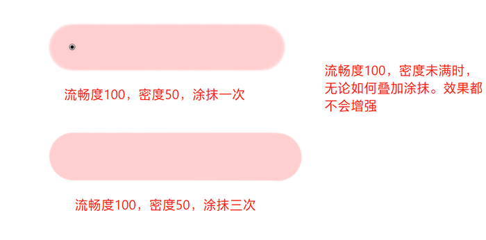 流畅度是控制画笔的压力,密度是控制画笔的浓度,这两个一起控制控制了画笔作用的不透明度,也就是指涂抹区域的效果的强弱。密度决定了产生某种效果的最大值,流畅度是每一次涂抹产生的效果值。例如流畅度50,密度100,涂抹一次就有35%左右的效果(图1),涂抹三次就可以达到全部效果。但和流畅度100,密度50(图2),无论你涂抹多少次只能达到50%的效果。