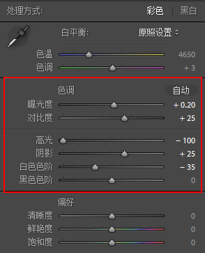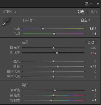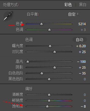 两边木门比较亮,比较抢中间的主体。首先稍稍加一些曝光(+0.2),使整张图片亮一些,接下来降低高光(-100)和白色(-35),使得两边木门的亮度降下来,再提高些阴影(+25),让中间部分的老人和背景的细节更凸显一些。再增加一些对比度(+25),让图片更加通透一些。