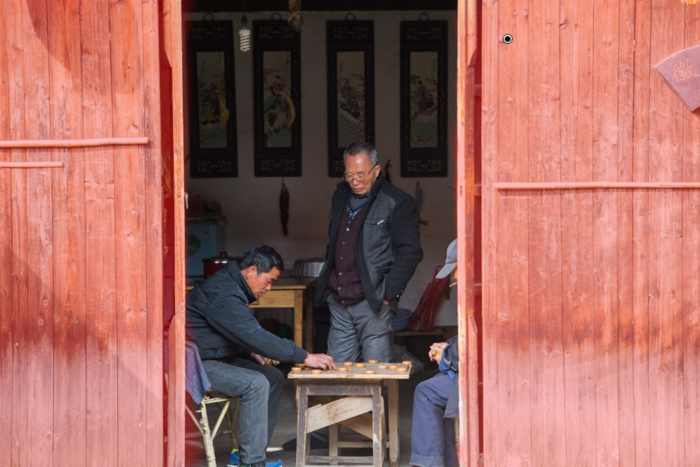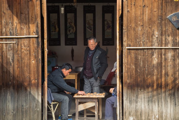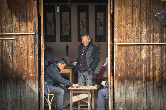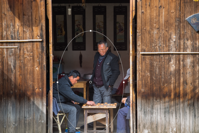 我们在拍照片的时候,需要考虑的情况有很多,除了相机的曝光、对焦、构图等因素之外,对于一些特殊的场景,我们还可以将后期处理的流程加入到前期拍摄的考量中,为照片留下充足的后期空间,得到最完美的影像。这是我在徽州采风拍摄的一张人文片子,拍摄时间大约是下午四点,刚好有几个老人在门口下棋,阳光洒在门框上非常有味道。但在相机里,当时由于门外有阳光直射,门框和门里下棋的老人光比较大。