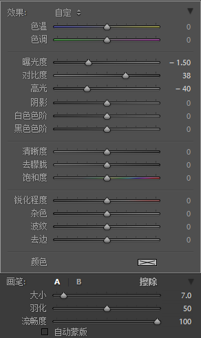 这里调整画笔到合适的大小,降低曝光(-1.5)和高光(-40),提高对比度(38),在两边的木门上涂抹,红色区域是我们要用画笔涂抹的区域。