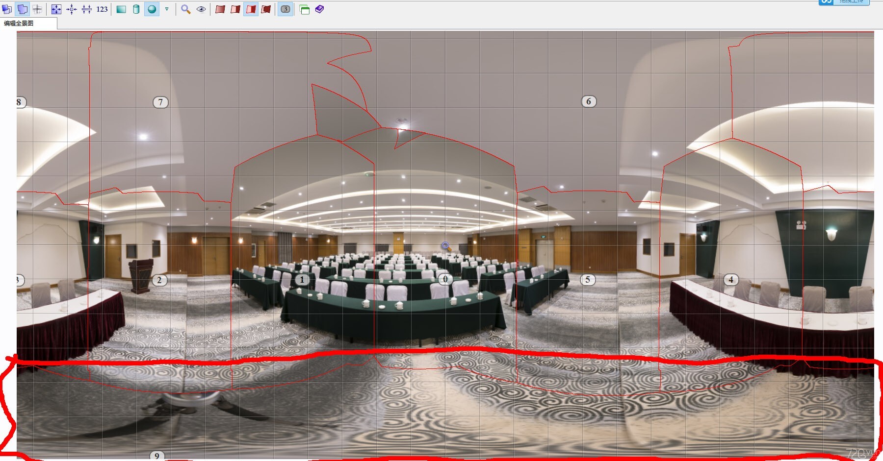步骤五:点选控制点选项,回到添加控制点界面,鼠标左键框选如下图位置,右键选择生成控制点,再按F5优化,相同编号的地面需与平面一圈照片中最少3张执行步骤5,即可得到完整补地的全景照片