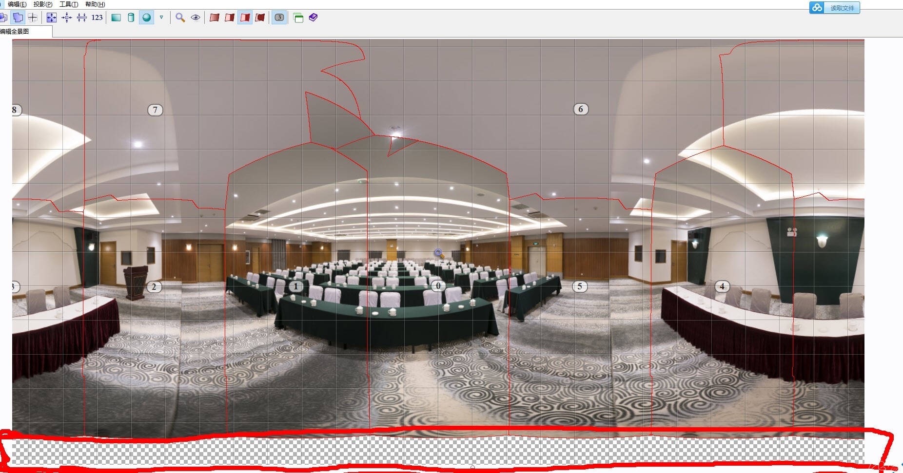 步骤一:拼接全景时只添加水平一圈的照片先行拼接,得到一张缺少地面的全景图