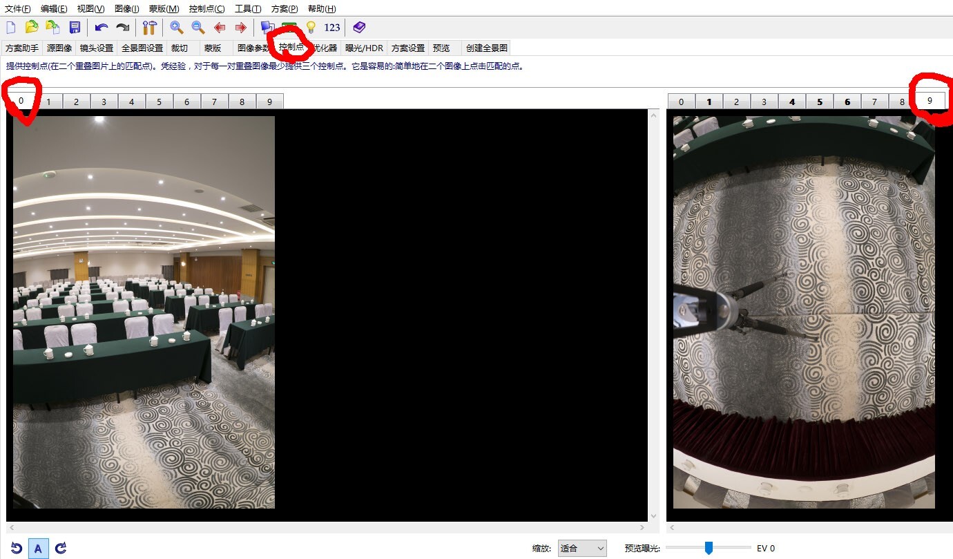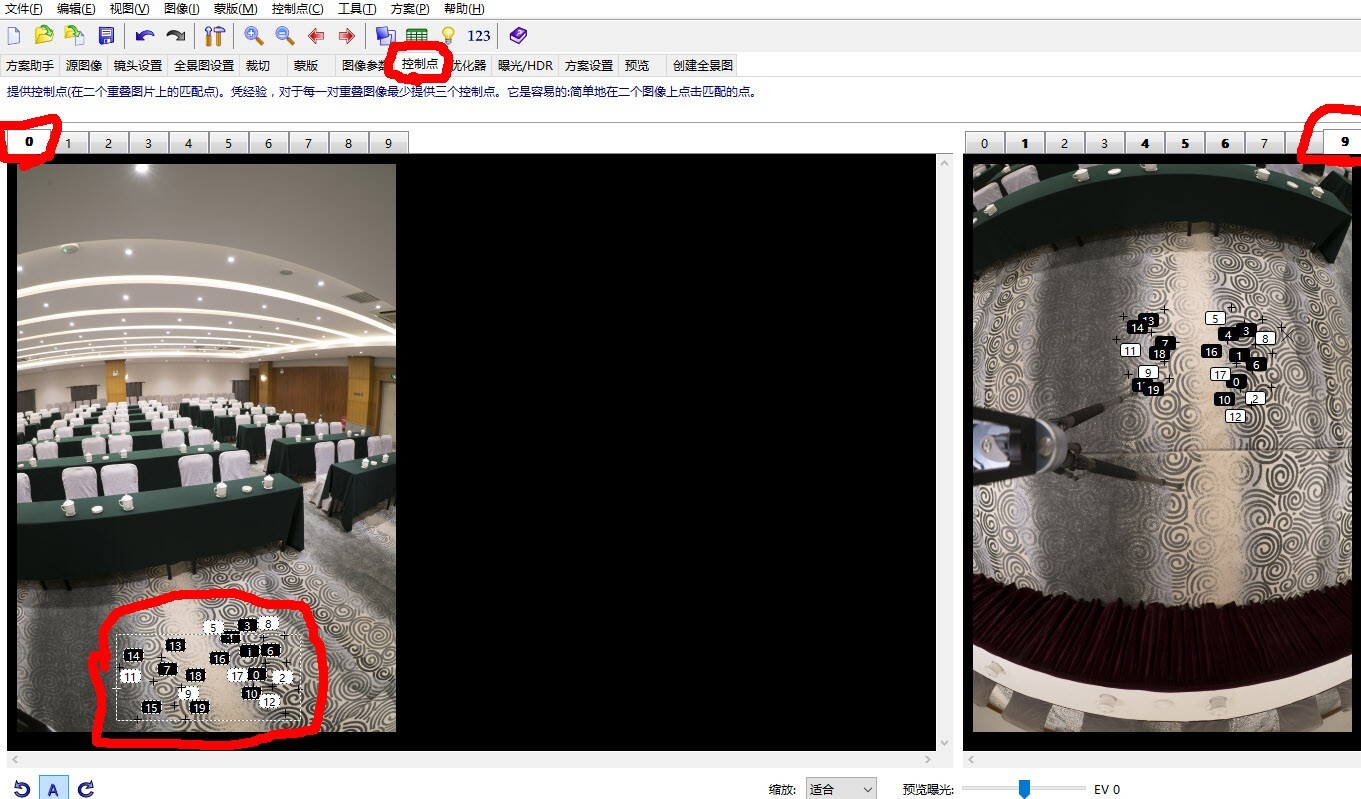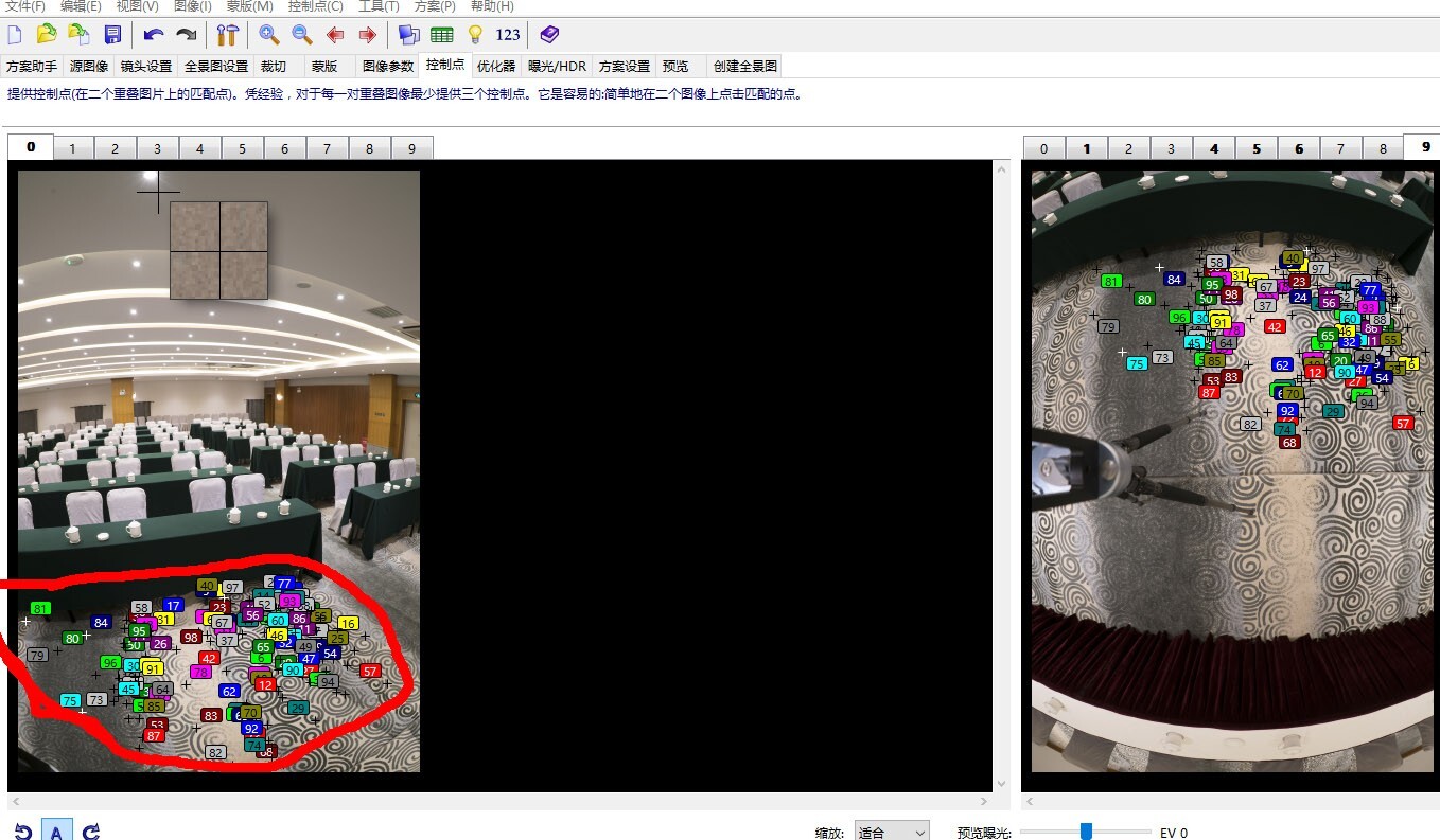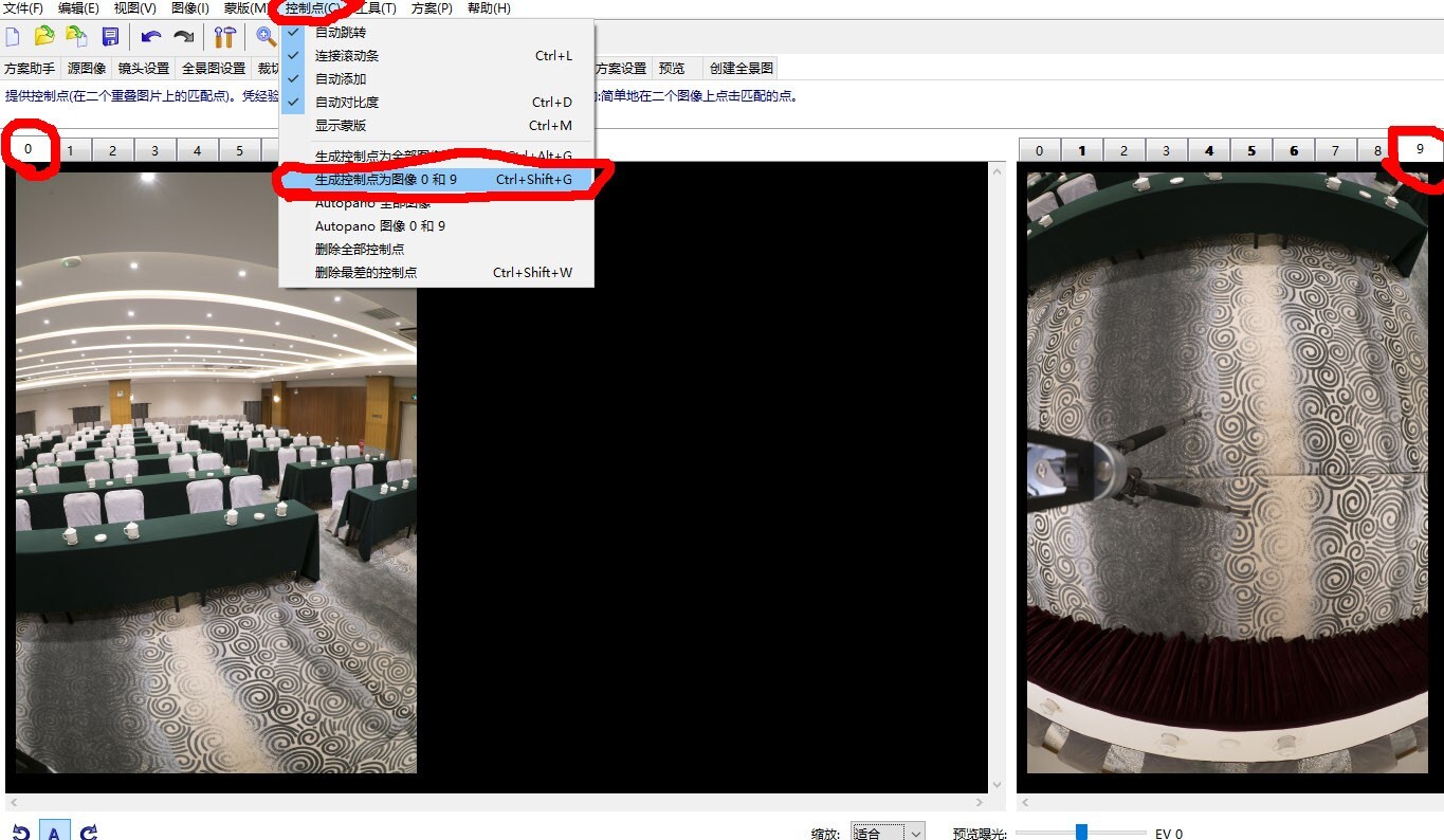 步骤三:点选控制点选项,在下拉菜单中点选生产控制点为图像0和9,处理完毕后就把地面编号为9的图拼接到全景图中,按F5确定优化(不论得到的数字有多大),再把得到的控制点全部删除