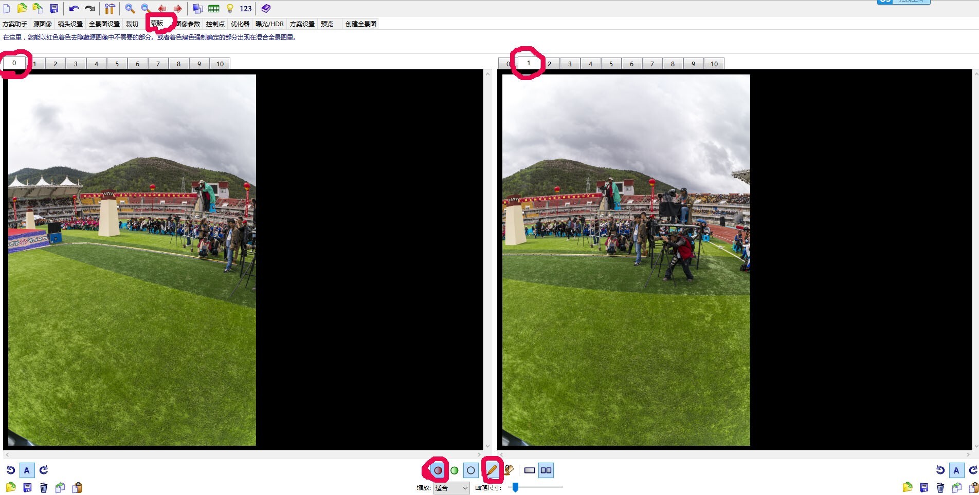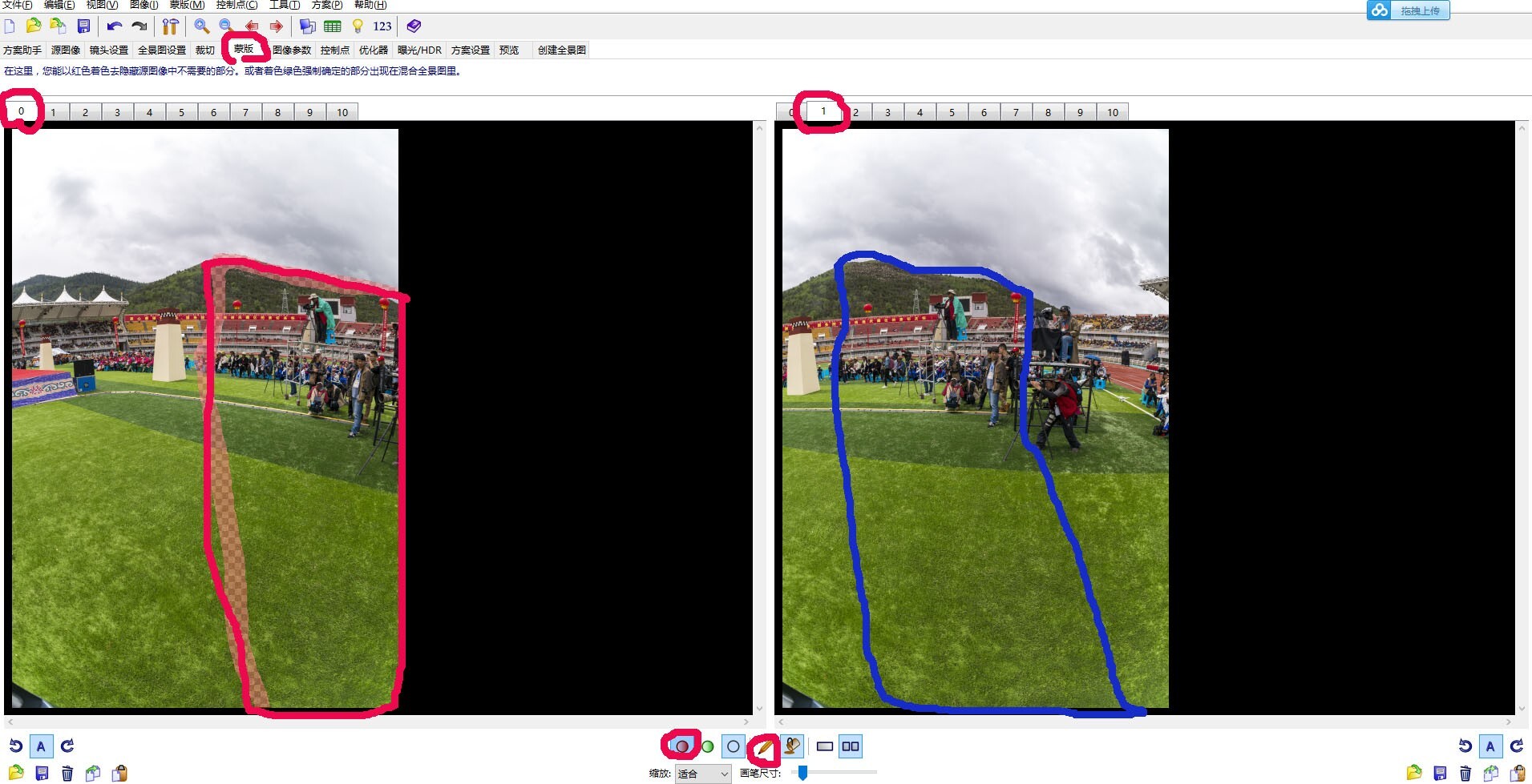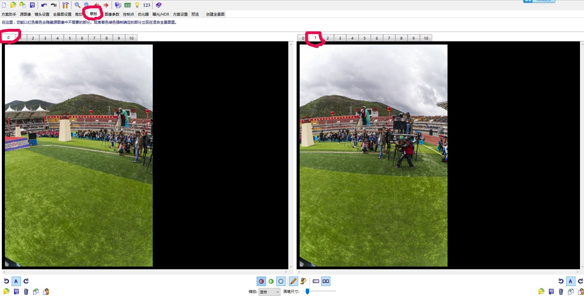 步骤一:合成拼接好全景后,点选蒙版选项,选取需要使用蒙版功能的相邻照片