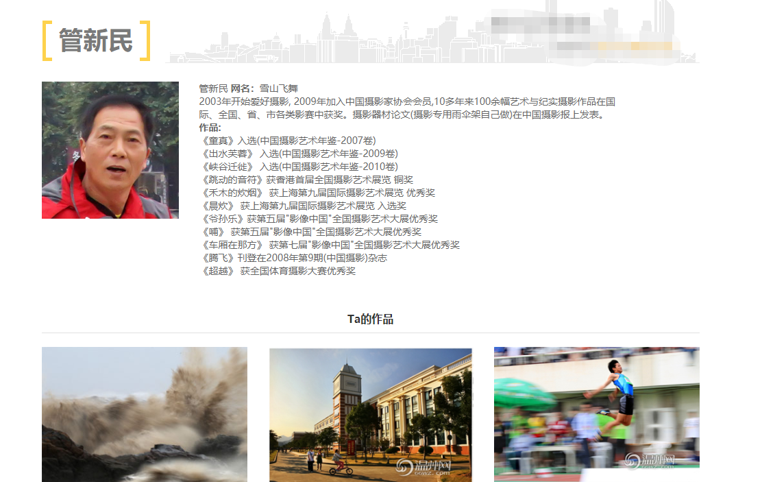 人物名片 管新民,网名“雪山飞舞”,1948年出生。中国摄影家协会会员,温州十佳摄影师,温州市体育局特约摄影师等。温州市首批无人机航拍 “飞手”,作为温州市体育局的特约摄影师,用无人机航拍过温州元旦万人健身跑、马拉松大赛、千人瑜伽等大型赛事。 长期为温州市残疾人事业公益拍摄,2015年被市委宣传部授予“温州十佳摄影师”荣誉称号;2016年被鹿城区宣传部授予“最美残疾人”等荣誉称号。 近些年,随着智能科技的发展,无人机开始进入人们的生活,航拍VR全景也成了当下摄影的流行趋势。人们开始拥有它,了解它,同时去享受在不同角度看世界的震撼和喜悦。 在温州就有这么一位年逾七旬的摄影发烧友,在无人机面世后短短四五年间,就入手了8架无人机。近日,记者采访了这位无人机航拍佼佼者——管新民老人,听他讲述用无人机航拍追梦的故事。 买了8架无人机的航拍“飞手” 今年72岁的管新民,是温州最早一批无人机航拍“飞手”。记者第一次见到他时,就从他身上感受到了一股年轻人的活力。“这是我买的第一架无人机,这是我现在用得最多的第八架无人机”。一见面,他如数家珍给记者展示着家里的无人机。 无人机在中国出现得较早,而用于航拍的无人机技术真正成熟起来的时间较晚,是在2013年~2014年。“我第一架无人机是大疆精灵2号,花了3500元通过网上团购到手的。”管新民回忆说。2014年12月份,他第一次从朋友口中听说可航拍的无人机。那时,温州市场上还没有卖无人机的实体店。 买来后,没有老师指导,他就自己看着说明书琢磨。第一次试飞时,他选择在空阔的瓯江上去飞,“当时做好了它可能掉落江中的准备。”管新民说,每一次飞出去都是提心吊胆,怕飞机收不回来。尤其那时的无人机,本身技术也不成熟,有时飞着飞着就没信号,“心脏病都要被吓出来。” 果不其然,没多久,他在丽水南尖岩航拍时就摔机了,飞机飞上去后不知道掉到哪里。当时他带着十来个人去找,好不容易才找回来。而拿去修理时,听说要半个多月才能修好,迫不及待的他觉得时间太难等了,于是又去买了一台同样型号的无人机。 2016年听说无人机又出新款了,性能、质量、画面更好,他又忍不住去买了第三架。第四架、第五架……,从2014年12月到2018年8月,短短四年多的时间里,他就购买了8架无人机。目前他手头是最新版的大疆御2,大疆御2是2018年8月23日向全球发布,“发布时很多人都拿不到货。”管新民说,他是提前三个月预定的,在8月27日就拿到机子,是当时温州市第一架御2无人机,“主机加配件合计花了12500元。” 航拍是梦寐以求的夙愿 “航拍,是我梦寐以求的夙愿。”管新民说,早在十几年前,他去新疆、甘肃采风时,看到当地的“小蜻蜓”飞机,虽然上天盘旋五分钟要500元,为了摄影创作,他眼睛都没眨一下就掏钱上去,第一次感受到航拍的魅力。 “无人机航拍的面世,使我的眼睛像长了翅膀,空中拍摄不再只是幻想。”管新民这样描述自己对无人机航拍的热爱。这些年,他带着无人机,不仅航拍过祖国大好河山,还航拍过北美洲的加拿大班夫国家公园、在印度航拍了世界上最大的宗教集会—— “大壶节”、在印度尼西亚航拍过原始部落…… 航拍,飞行器在天上极难控制,操控摄影器材是个精细活,要花大量时间和精力去琢磨和总结。讲起这几年的无人机航拍心得,管新民老人说,无人机航拍学问挺大的,想要做个合格的飞手,确保人机安全。只有老老实实耐心地读懂无人机说明书,胆大心细加勤学苦练。 上网学VR全景制作 当VR遇到航拍,可让人身临其境用不一样的视角看世界。为了让更多人感受不一样的“光与影”,最近,管新民迷恋上了在朋友圈发布720度全景VR作品。 比如在2018年10月22日发布的《璀璨瓯越》,手指点点即可身临其境感受瓯越大地灯火辉煌,瓯江两岸大厦霓虹与江水相映生辉;11月7日,上传的五马街旗袍秀VR,从空中俯瞰五马街的刚柔与沧桑…… “会航拍还要会制作,最近我正在学习VR全景制作。”管新民说,他喜欢一切与摄影有关的知识,喜欢学习先进的技术,提供不一样的视角看世界。720度全景技术是目前全球范围内迅速发展并逐步流行的一种视觉新技术。为了把全景VR技术学得更精益求精,他还特意在网上找到南宁一大学的一个老师,花了一千多元购买了直播网课。 “VR全景图片做得好不好,从补天的技巧上就能看出破绽的”。采访时,管新民仔细地给记者指着图像上的某个地方说,“这个地方镶嵌时天空的蓝色就有点偏差。” “生命不息,学习不止”,这是管新民微信朋友圈的备注,这也正是他虽然年逾古稀,仍走在时代潮流最前沿的秘诀。 VR全景的应用价值 “无人机”“航拍”“VR全景”这些看似离老年人相去甚远的词汇,却在管新民这位年过古稀的老人身上巧妙的融合起来,用自己的实际行动展现出VR全景带来的无限魅力。而VR全景的价值不但体现在艺术作品欣赏中,也被商家广泛应用于商业领域。例如:最近在广告中频频出镜的“贝壳找房”就通过VR全景实现了线上随时随地看房,不用出门即可身临其境的便捷体验。 还有“支付宝口碑”“京东”“携程”“飞猪”“汽车之家”“优信二手车”等各行业的龙头企业也上线了各自的的产品VR展示。VR全景到底有什么样的魅力,能吸引这些表面上没有关联的行业纷纷涉足呢? (点击图片查看