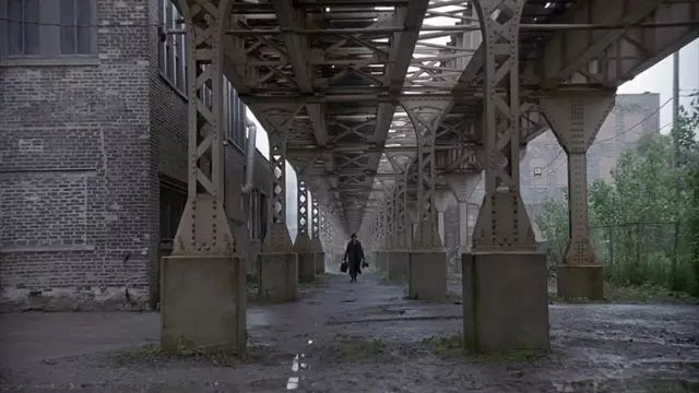 而《霹雳钻》里也有精妙的远景镜头,多重的框架把人物很好的放在了正中。你可以直接看到这个仓库门的中心,左边是一扇完整的门,右边有一个垃圾桶。背后还有一个铁杆构成的矩形门框,以及金属圈内的另一个门框,简直是完美的构图!