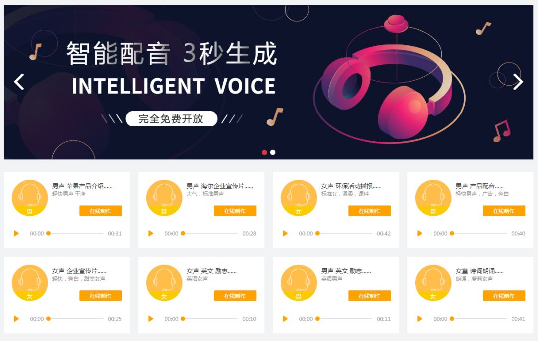 智能配音——当配音员缺席时,可以用AI机器人在线配音代替,输入内容,3秒生成配音,省时高效。