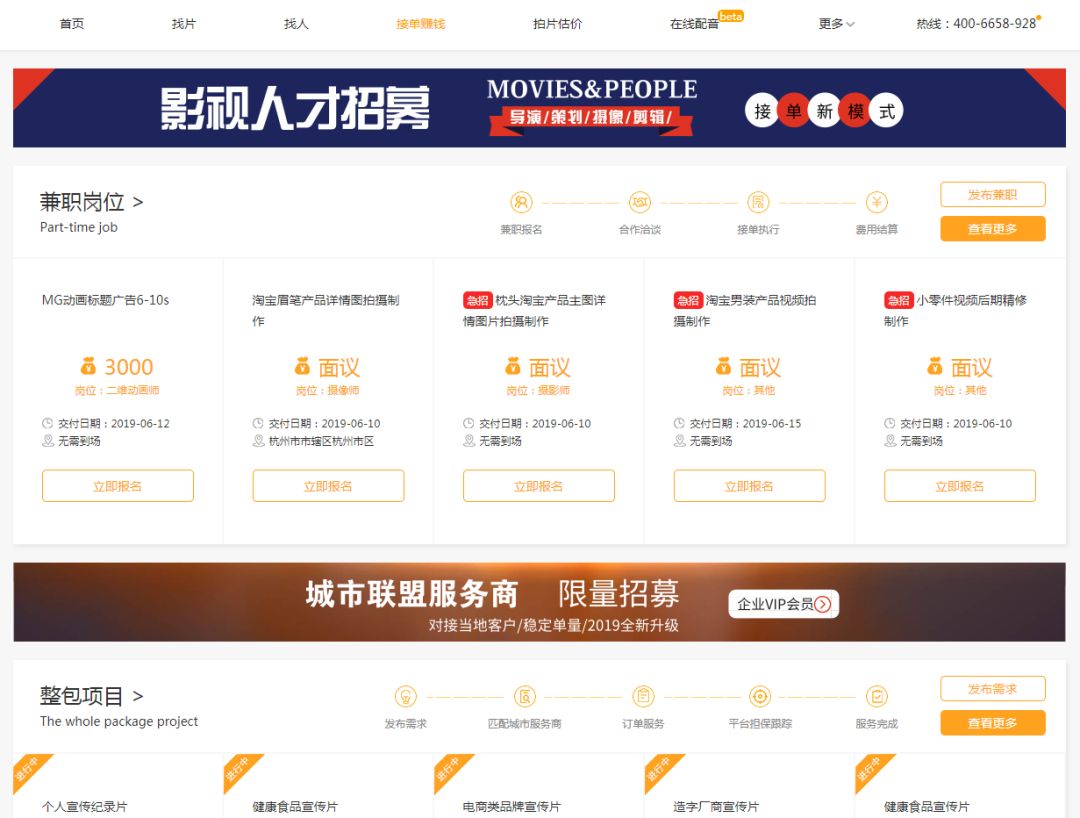 接单赚钱——为影视人提供更加垂直的接单渠道,作为影视创作者可依靠技能在空闲时间获得额外收入,还能接到影视公司无法消化的外包订单。