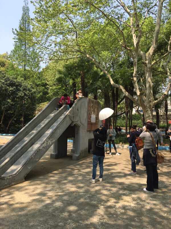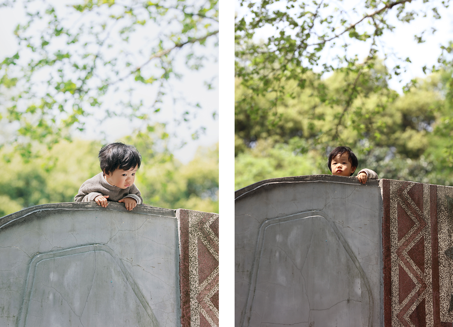 我找到了一个树冠,想要打造茂密的小森林的感觉。阳光从后面射来,背后的树叶呈现流光溢彩的美好,可是身处树下又是背光,孩子的面部缺乏光线而显得质感不佳。于是我在前侧方加了我的补光套装,得到了明亮而柔和的面部光线。