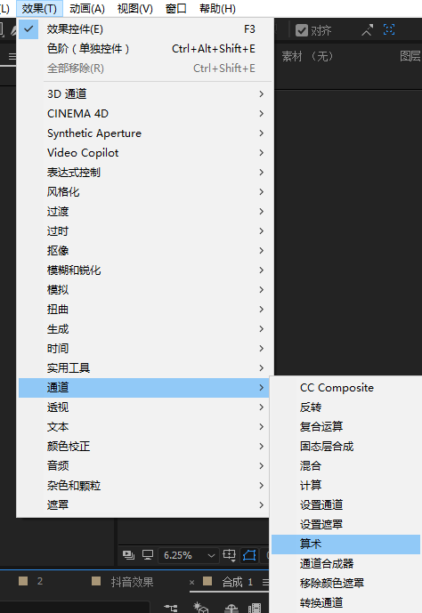 然后在菜单栏里找到“效果”-“通道”-“算术”