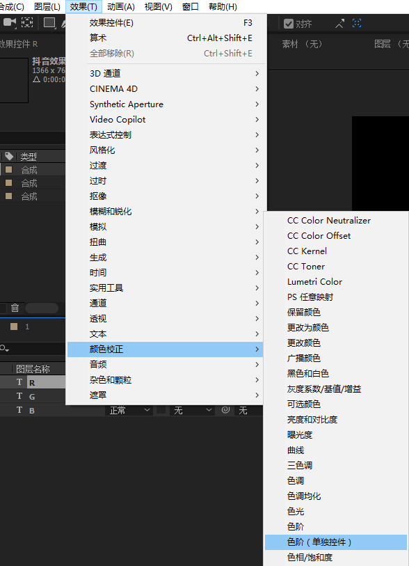 在菜单栏找到“效果”-“颜色效正”-“色阶(单独控件)”