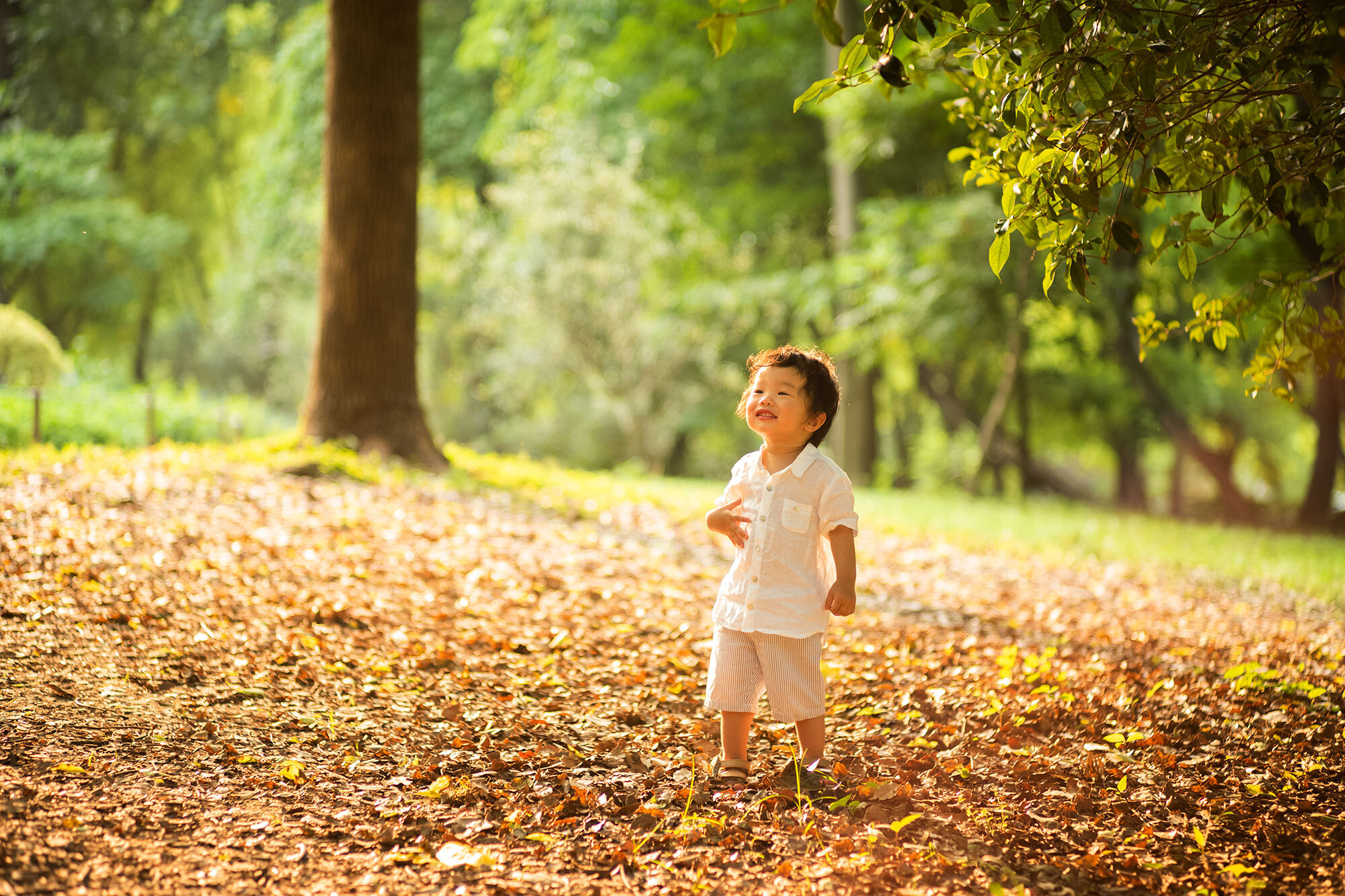 这流光溢彩来自哪里?来自焦外的反光,所以避开大片的水泥地水泥路,在草地、落叶堆这样的地面拍摄,可以得到闪闪发亮的地面而避免一片地面反光过曝。