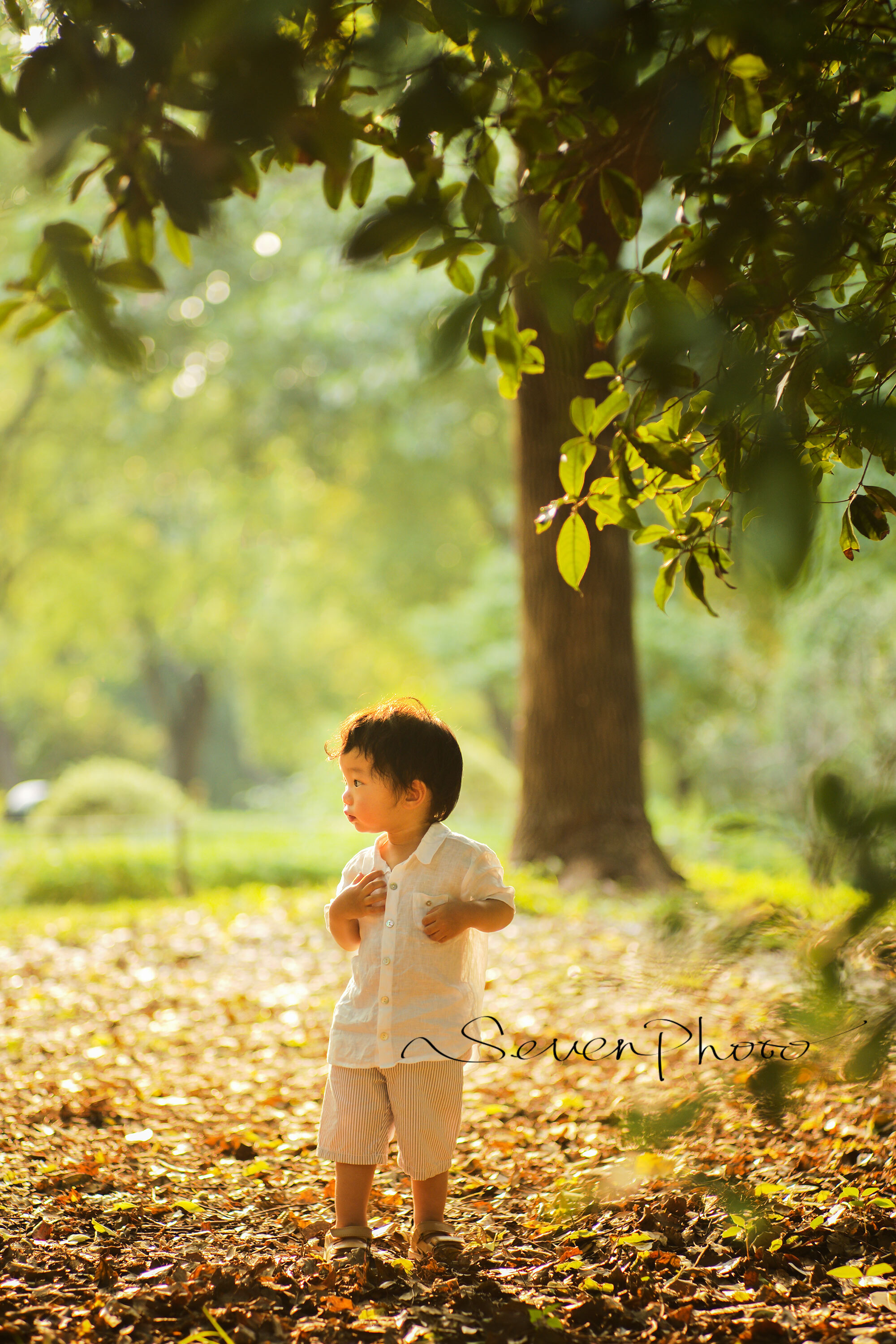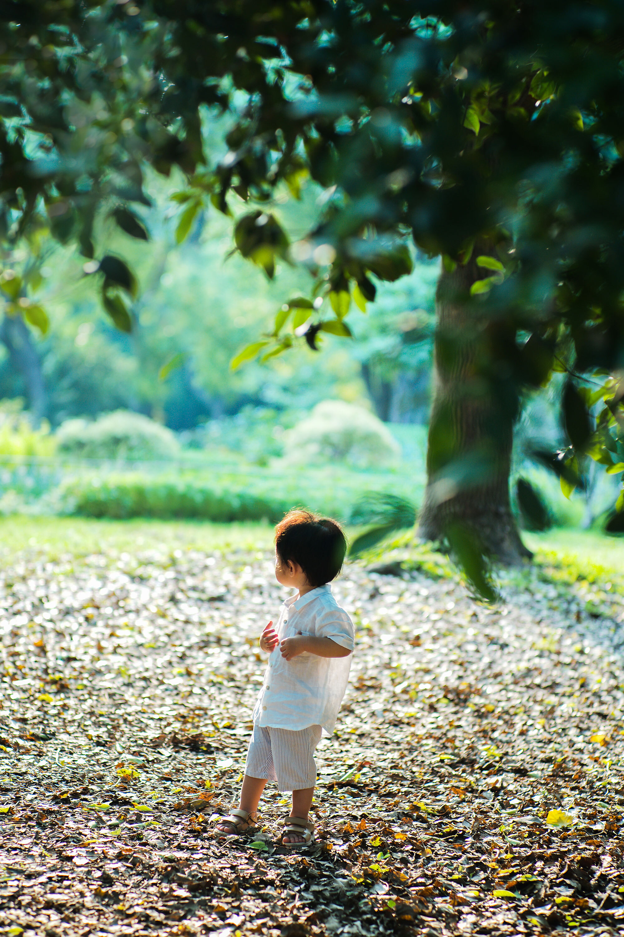 今天分享的两组图片,拍摄于上午10点半,你可以看到光其实已经开始强烈了,部分直射区域甚至有些过曝 。 树下的小男孩拍摄于下午5点半,光线相当柔和并且泛出金色,是拍摄逆光照的好时机。“逆光“顾名思义就是要把光线放在人的身后,那光线能够呈现如此明确角度的,无非就是初升和落日,初升太早难以捕捉,建议在4到5点左右开展你的拍摄为宜。