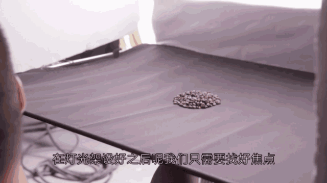 这个镜头把机位架在了顶部,咖啡豆底部用黑布做背景。机位的上方打了一盏灯作为主光源,然后加上柔光布,在左右两边使用米菠萝进行反光。让灯光尽可能覆盖整个白布,白布尽量贴近被摄主体,远离灯的方向,这样就可以得到相对比较柔和的光线。